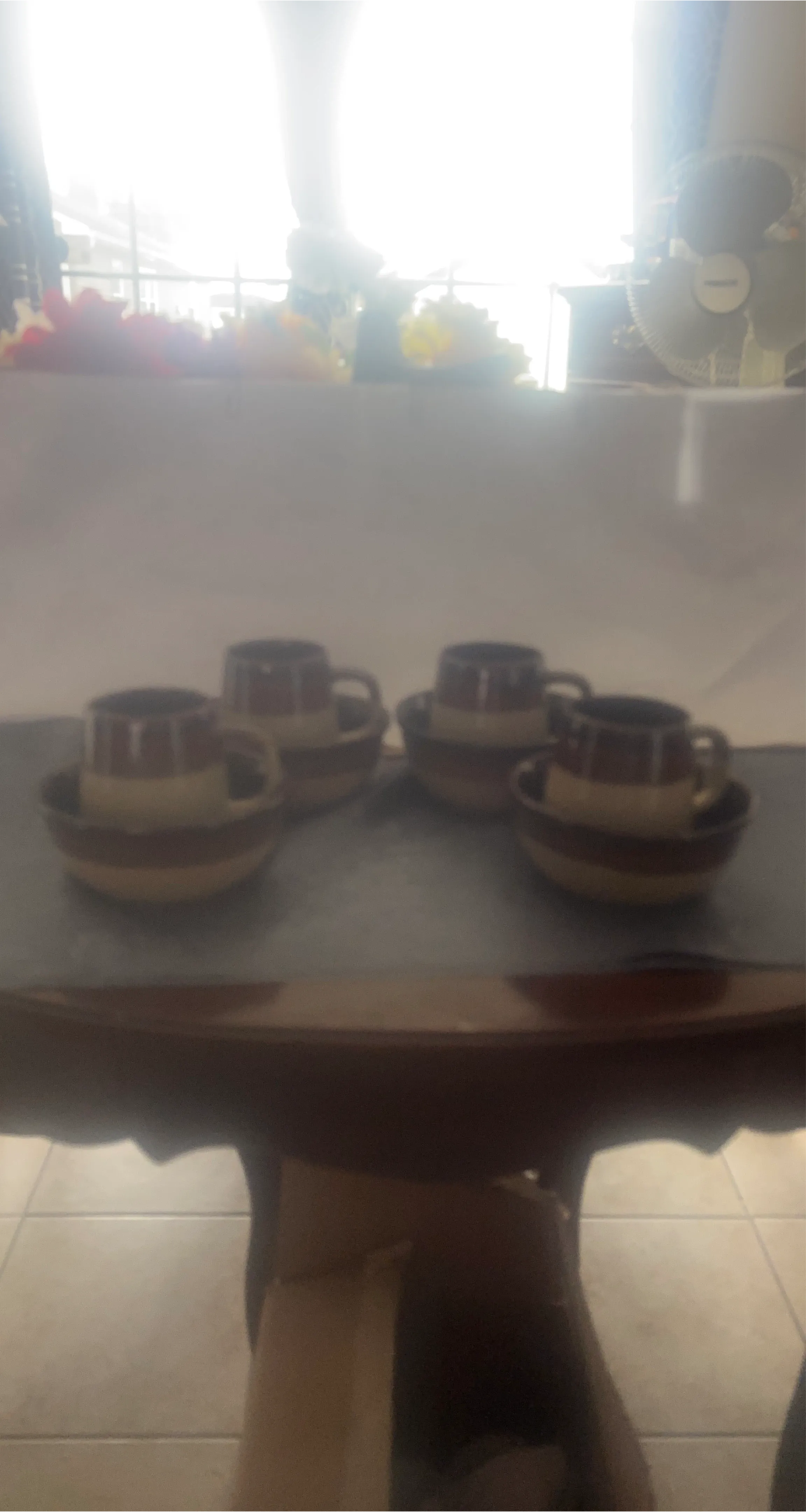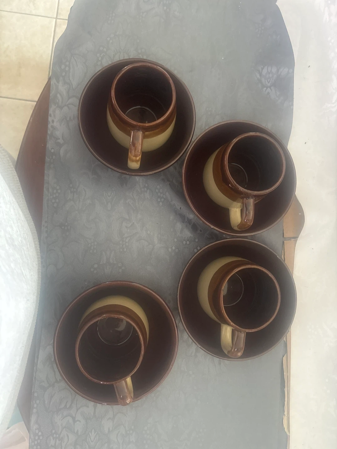 Four brown and cream ceramic coffee cups and saucers. This set is perfect for serving guests or enjoying a quiet moment with a hot beverage. Material is ceramic.