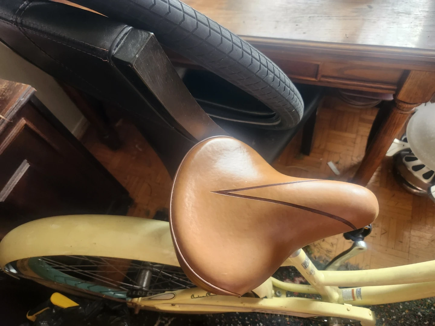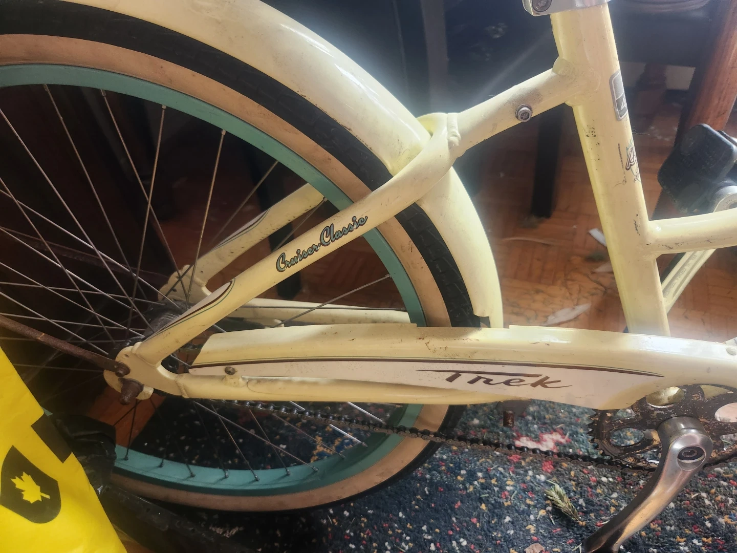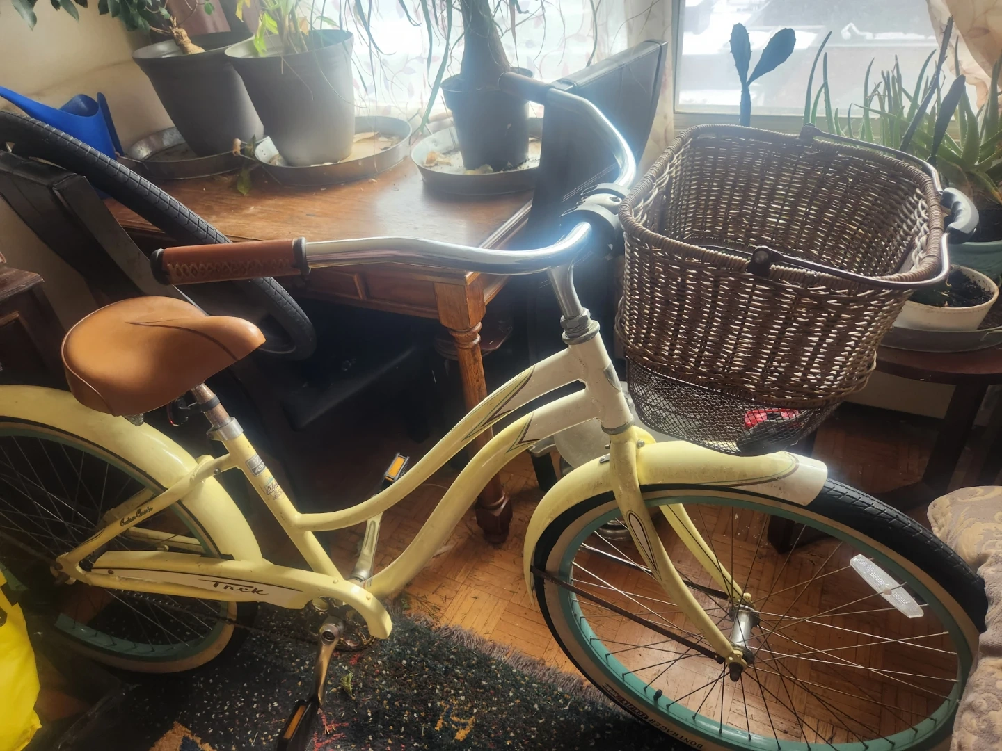 A yellow Trek Cruiser Classic bicycle. It's a 17" (43 cm) frame size with Alpha Aluminum construction. It includes a front basket and a comfortable saddle. White wall tires a real head turner