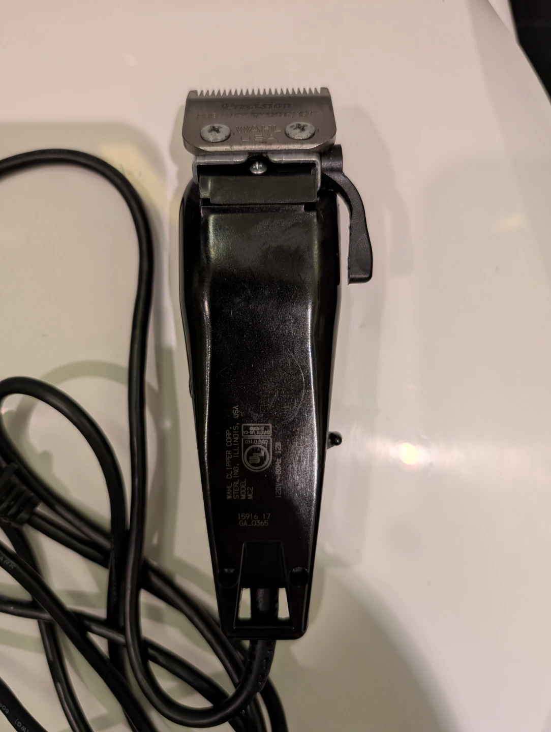 This is a Wahl corded hair clipper. It's black with a chrome accent. The cord is quite long. It's suitable for home haircuts.