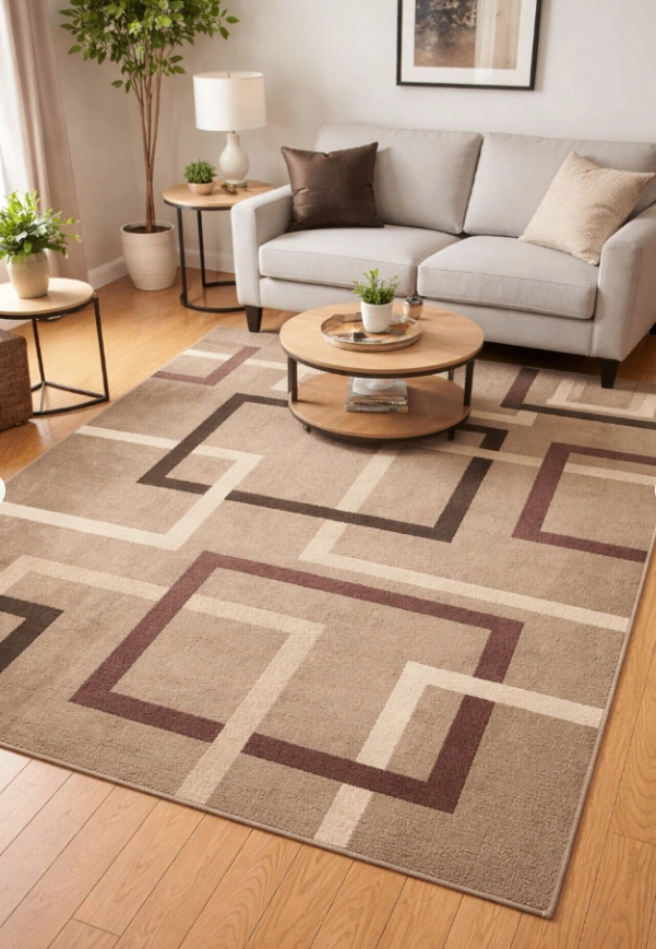 Stylish pre-owned area rug featuring a modern geometric pattern in neutral tones of beige, brown, and cream that easily complements many home décor styles. Perfect for a living room, bedroom, or office space. Clean and well maintained.