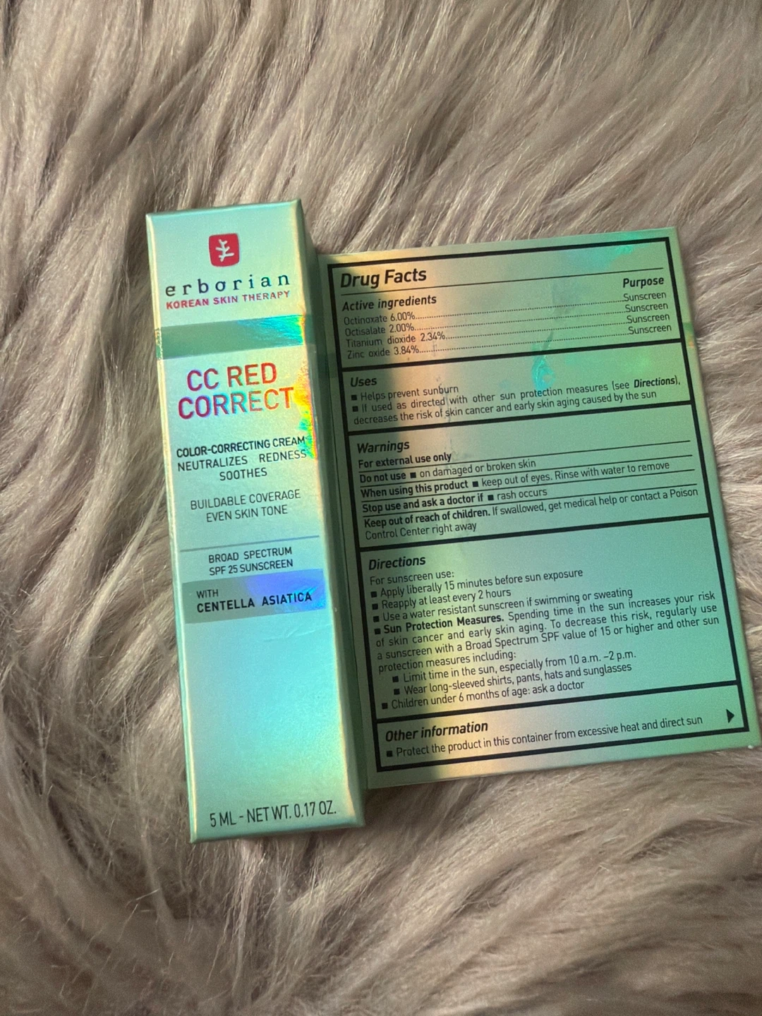 This CC Red Correct cream neutralizes redness for buildable coverage that soothes. It's a broad-spectrum SPF 25 sunscreen with Centella Asiatica. The formula helps prevent sunburn and decreases the risk of skin cancer and early skin aging.