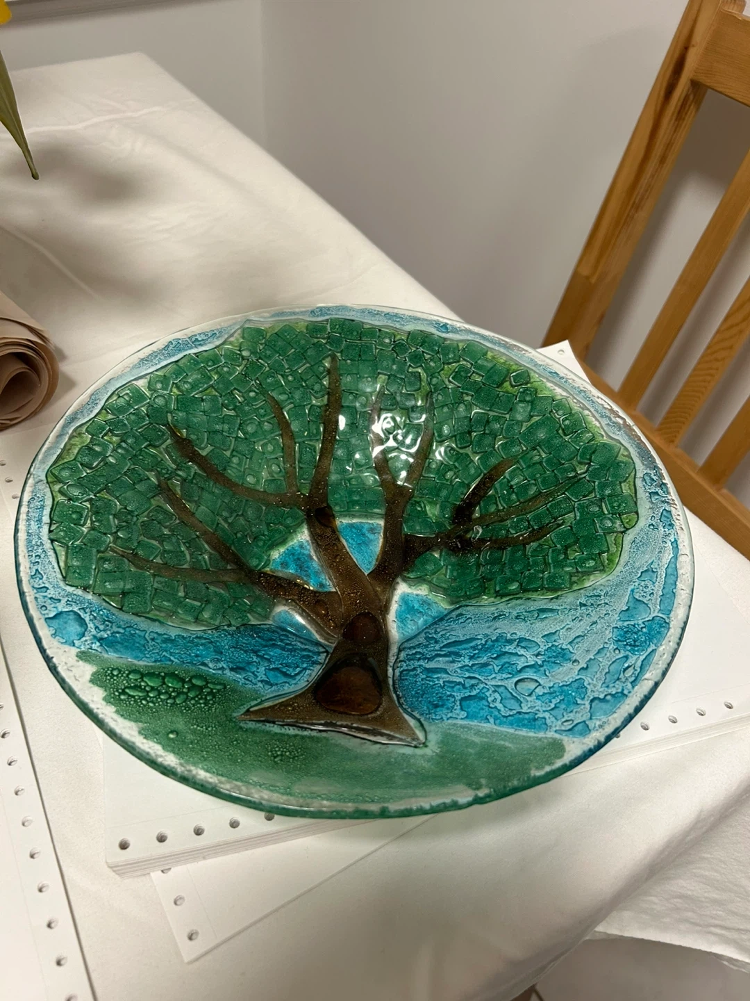 Selling a lovely decorative glass plate featuring a tree design. The plate has a beautiful combination of green, blue and brown colours. It would look great as a centrepiece or wall decor!
