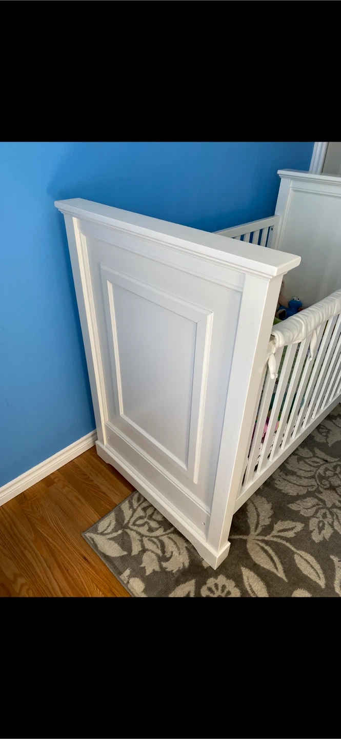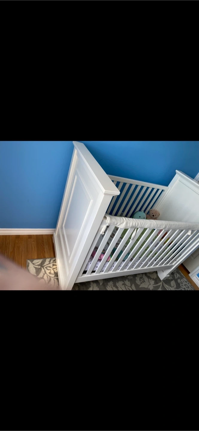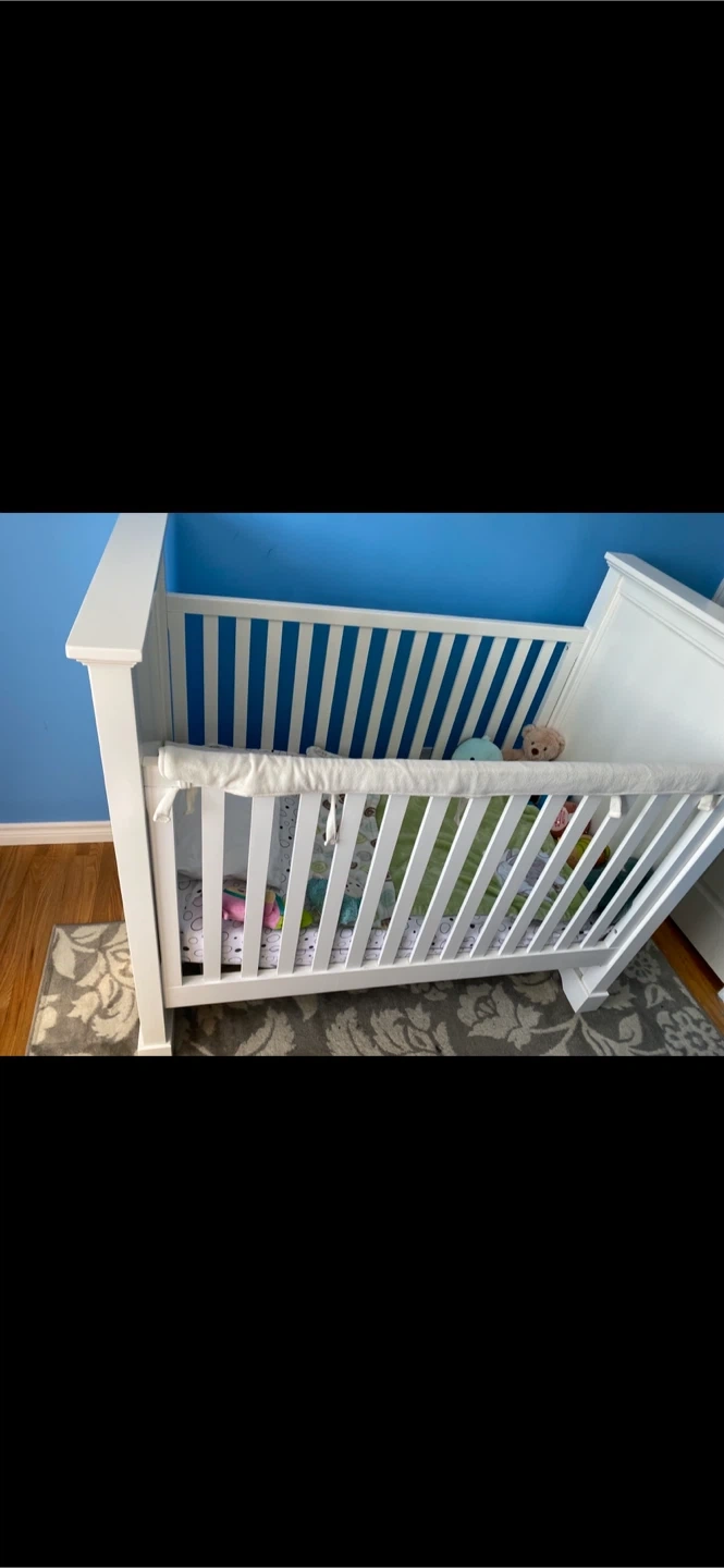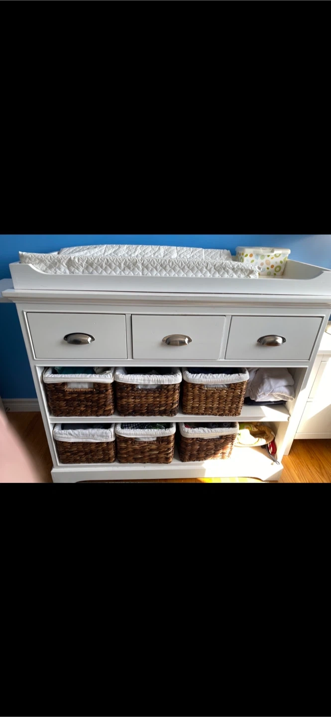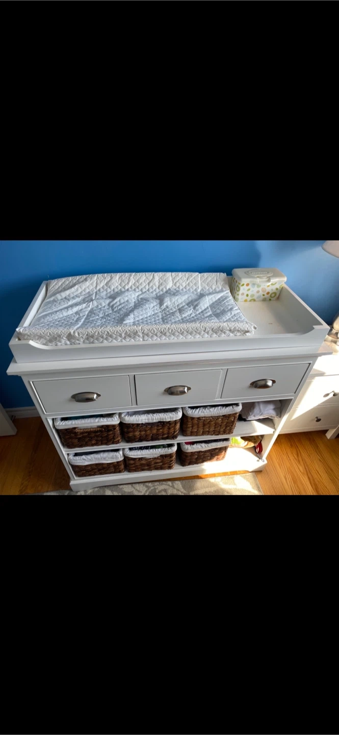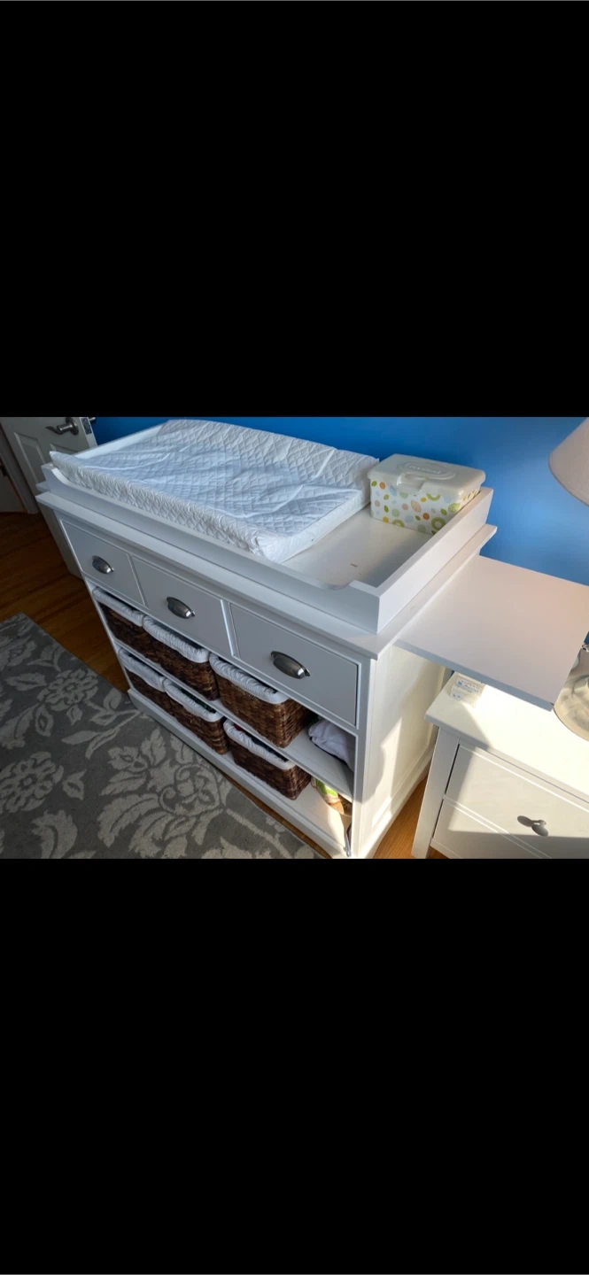 This is a white crib and changing table set from Restoration Hardware Baby & Child. The changing table includes several drawers and wicker baskets for storage. Both pieces are made of wood.rocking chair blue and white