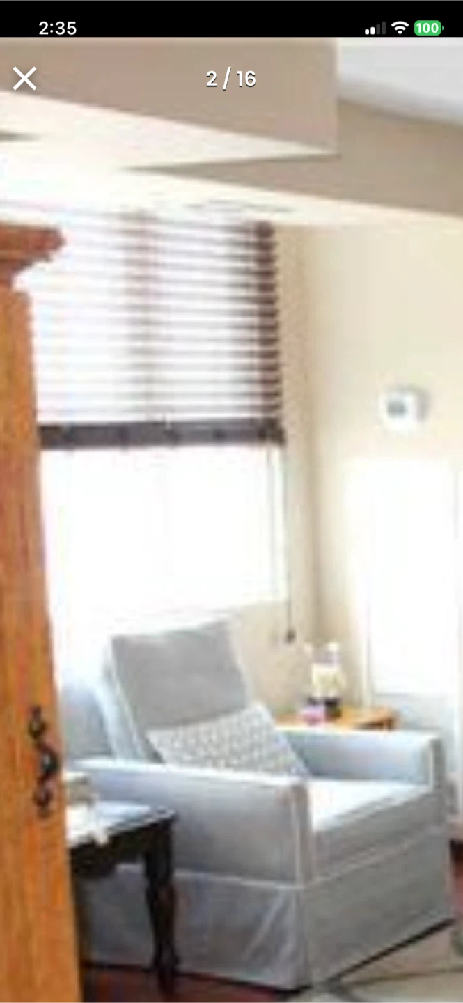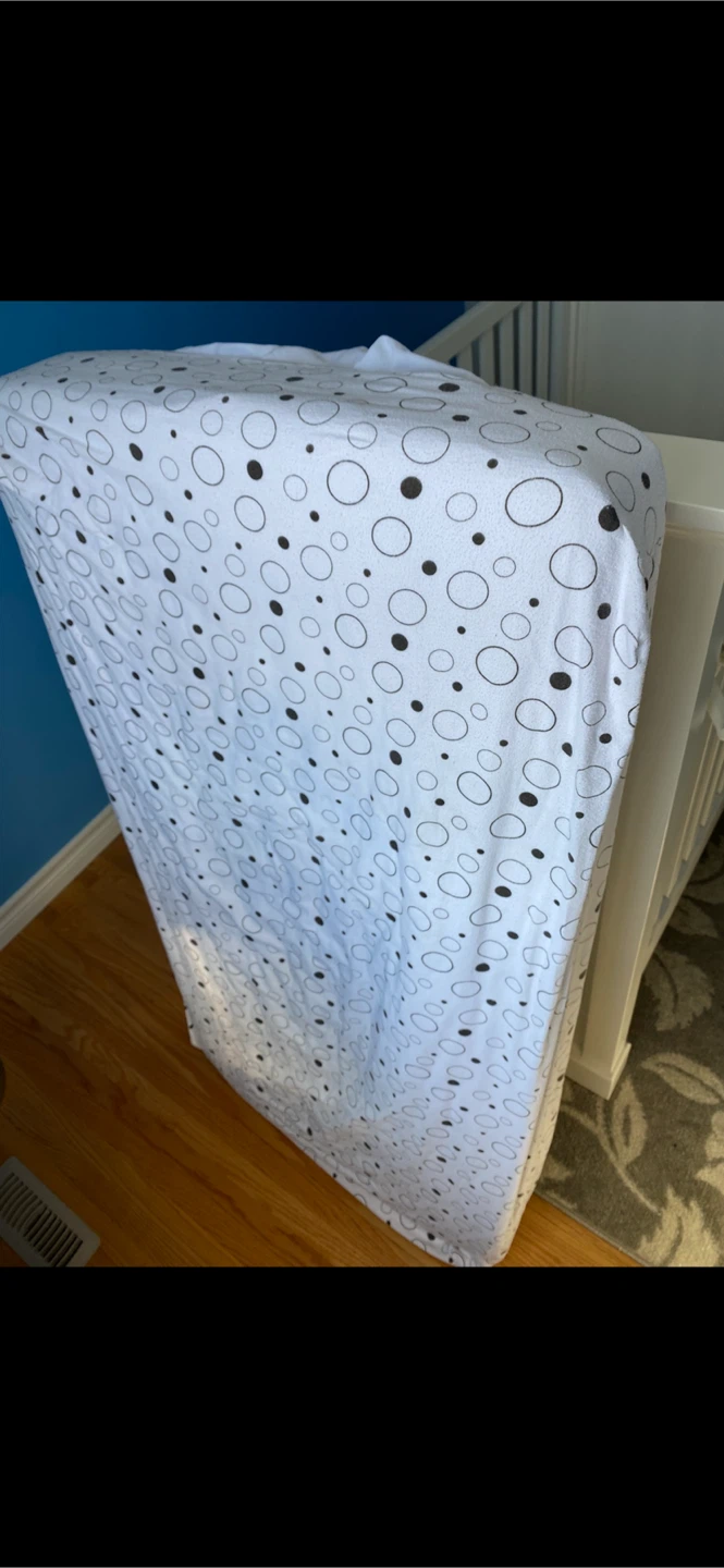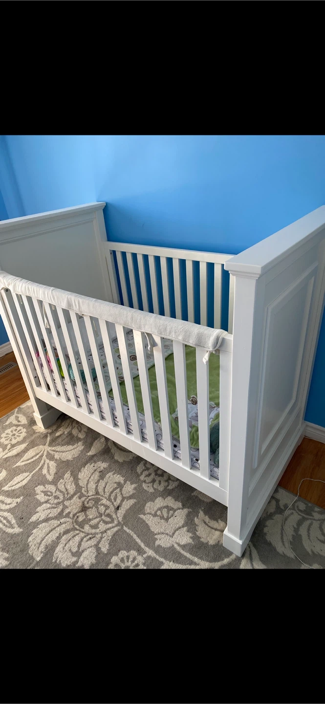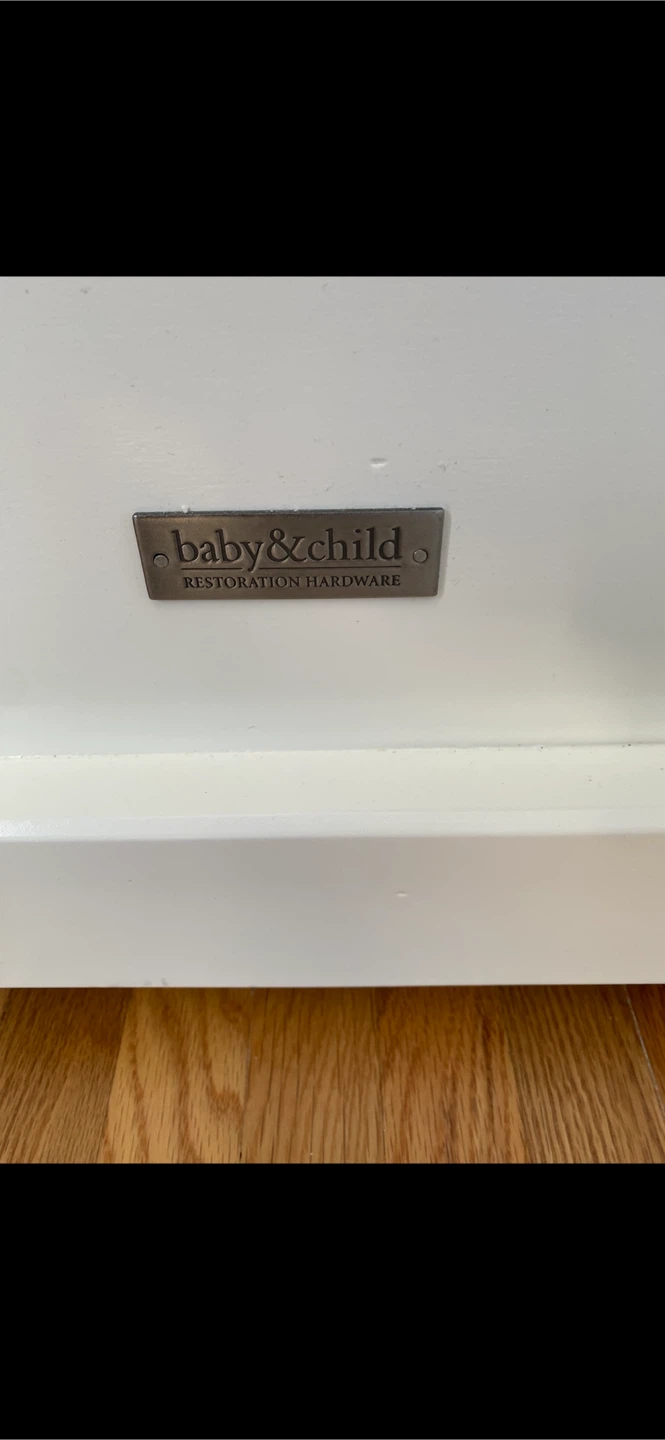 This is a white crib and changing table set from Restoration Hardware Baby & Child. The changing table includes several drawers and wicker baskets for storage. Both pieces are made of wood.rocking chair blue and white