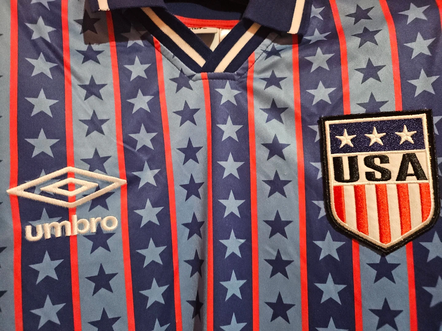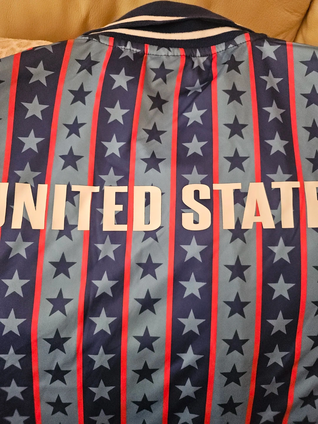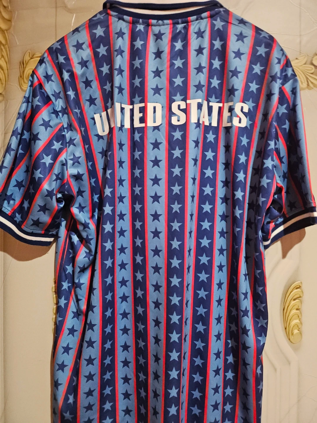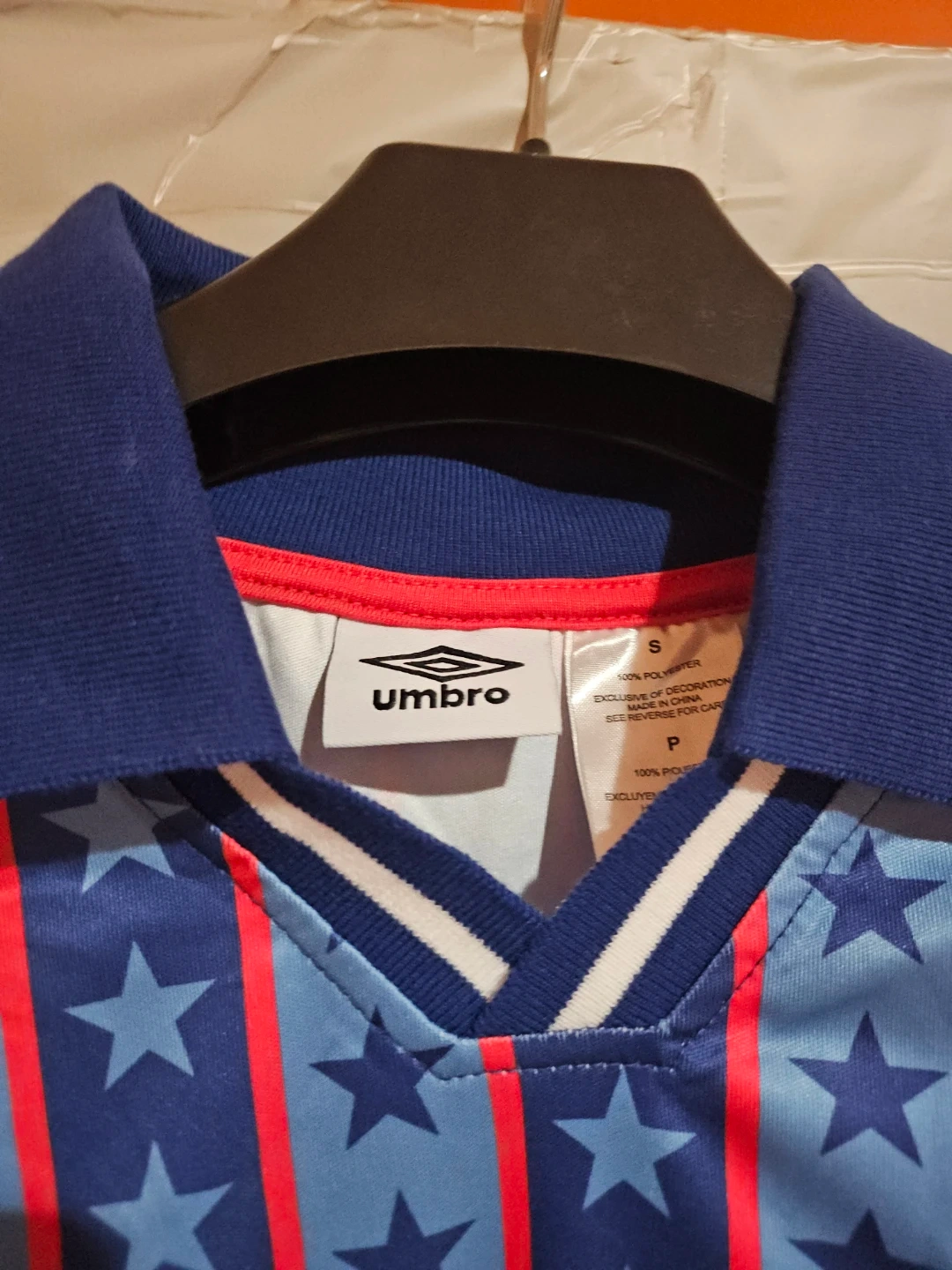 This Umbro soccer jersey features a bold stars and stripes design. It's made of 100% polyester. Size is S.