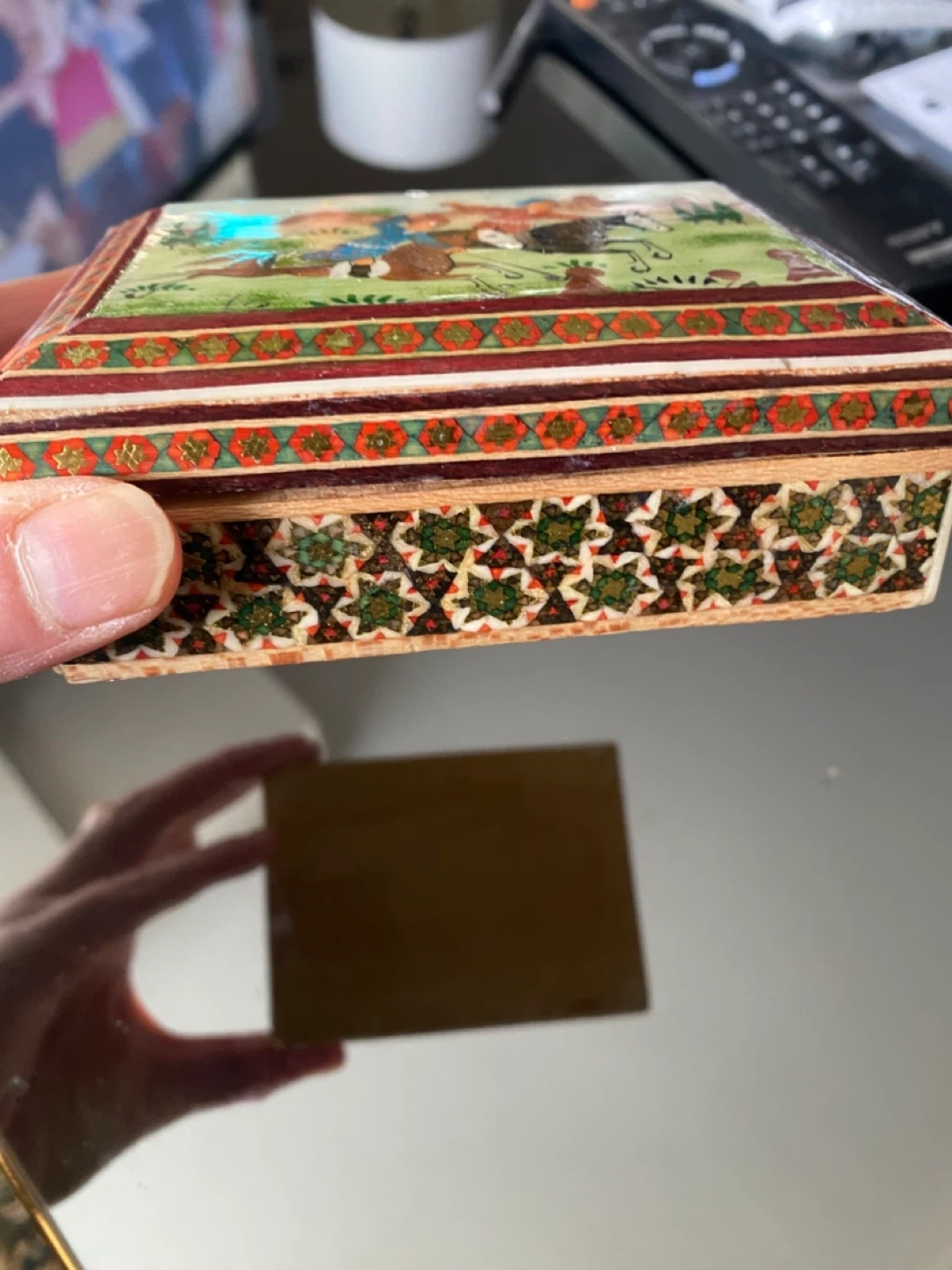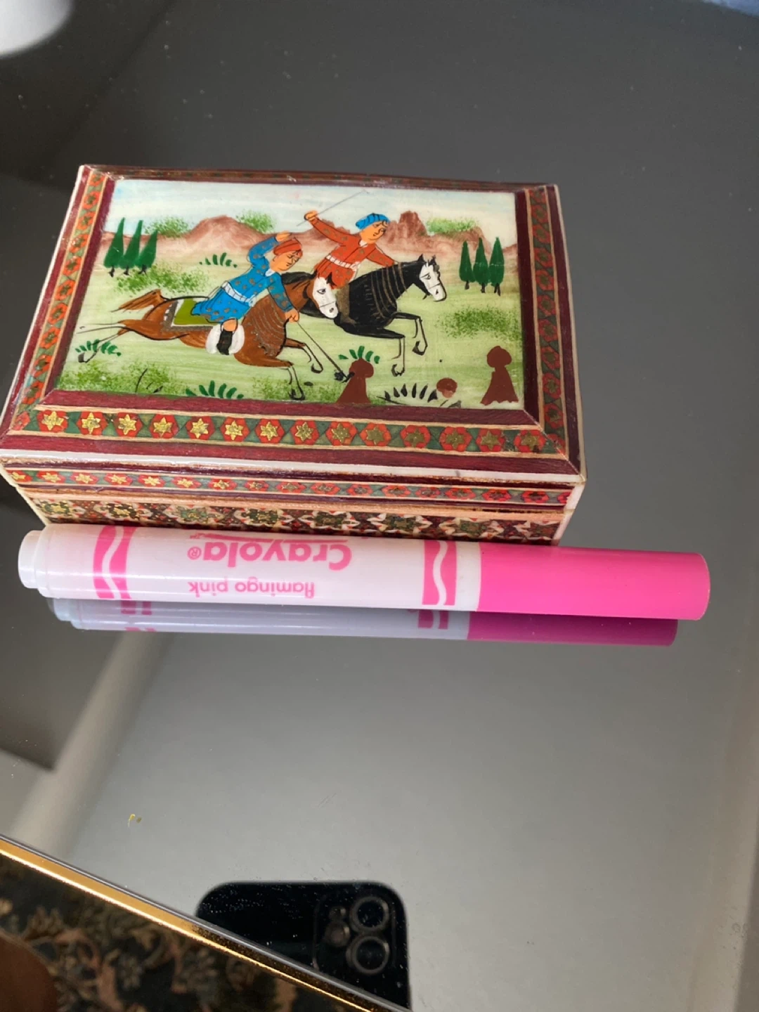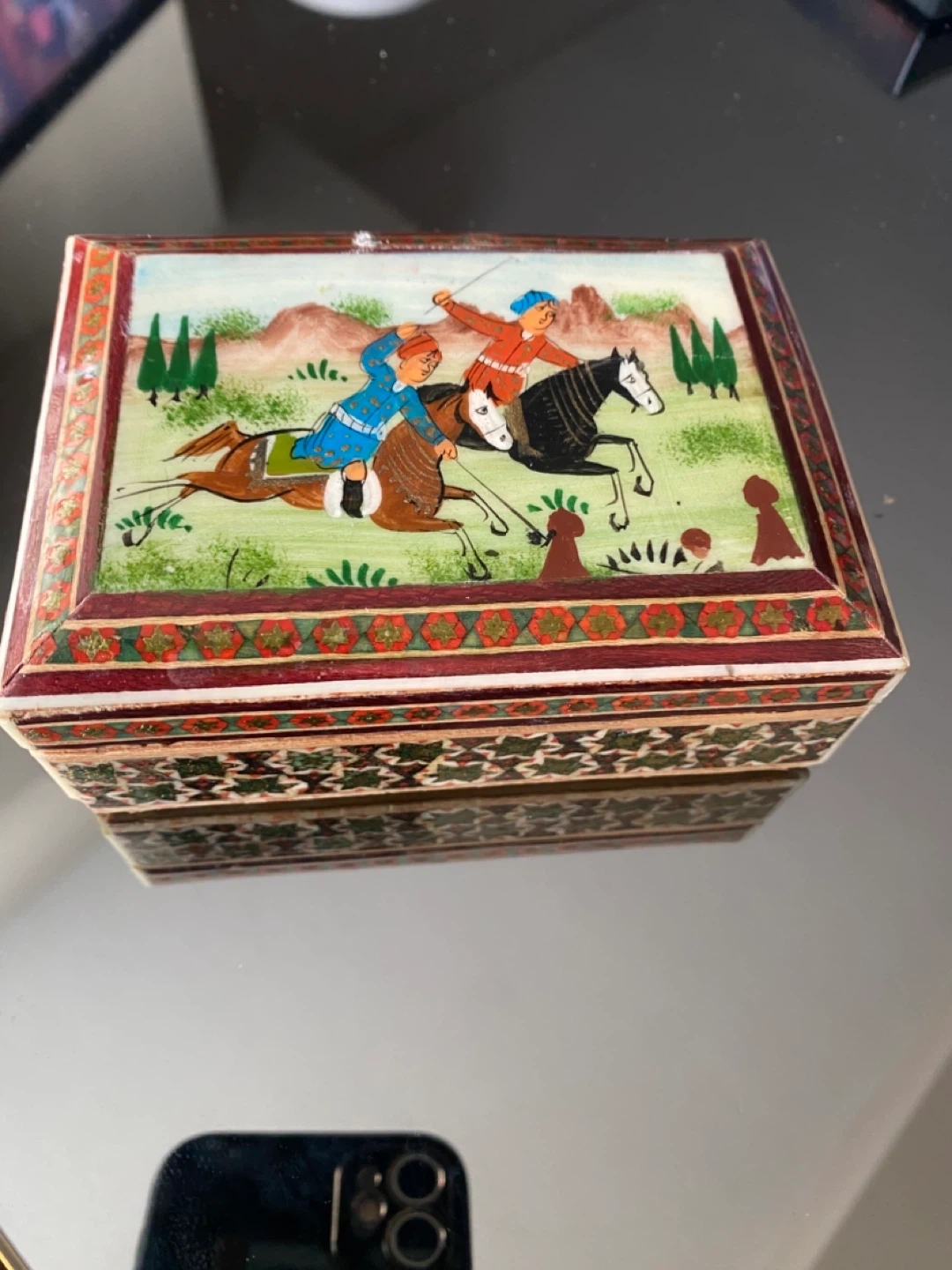 This is a vintage decorative wooden trinket jewelry box with painted imagery. The lid depicts a scene of people on horseback. The sides are adorned with intricate patterns. It's perfect for storing small treasures or keepsakes!