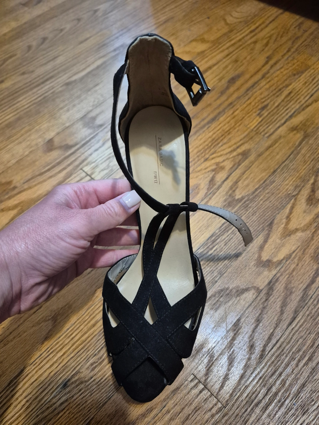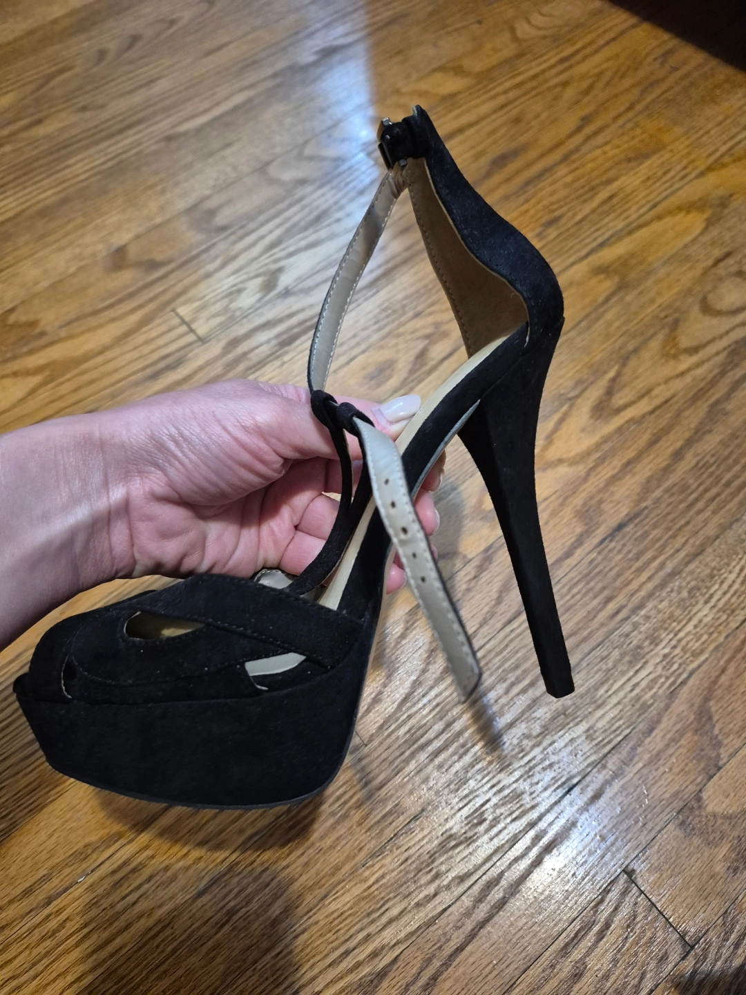 Elegant black suede platform heels. Ankle strap closure. High stiletto heel. Open toe design. Cross-strap detail. Excellent for special occasions.