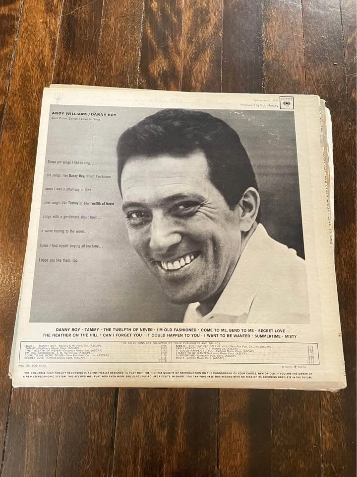 Classic crooner vinyl featuring Andy Williams in peak form. Includes a heartfelt mix of romantic and easy listening tracks — perfect for collectors, lounge listeners, or vintage vinyl lovers.