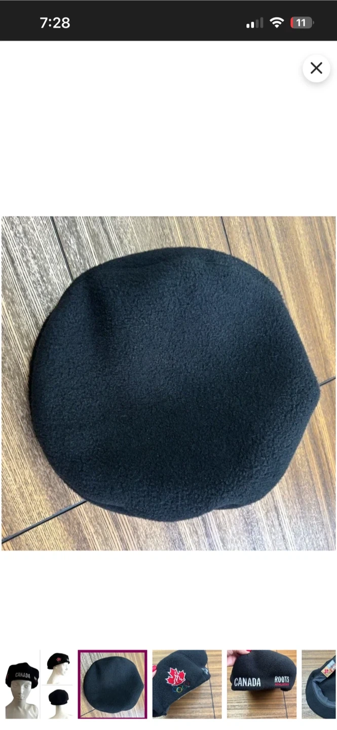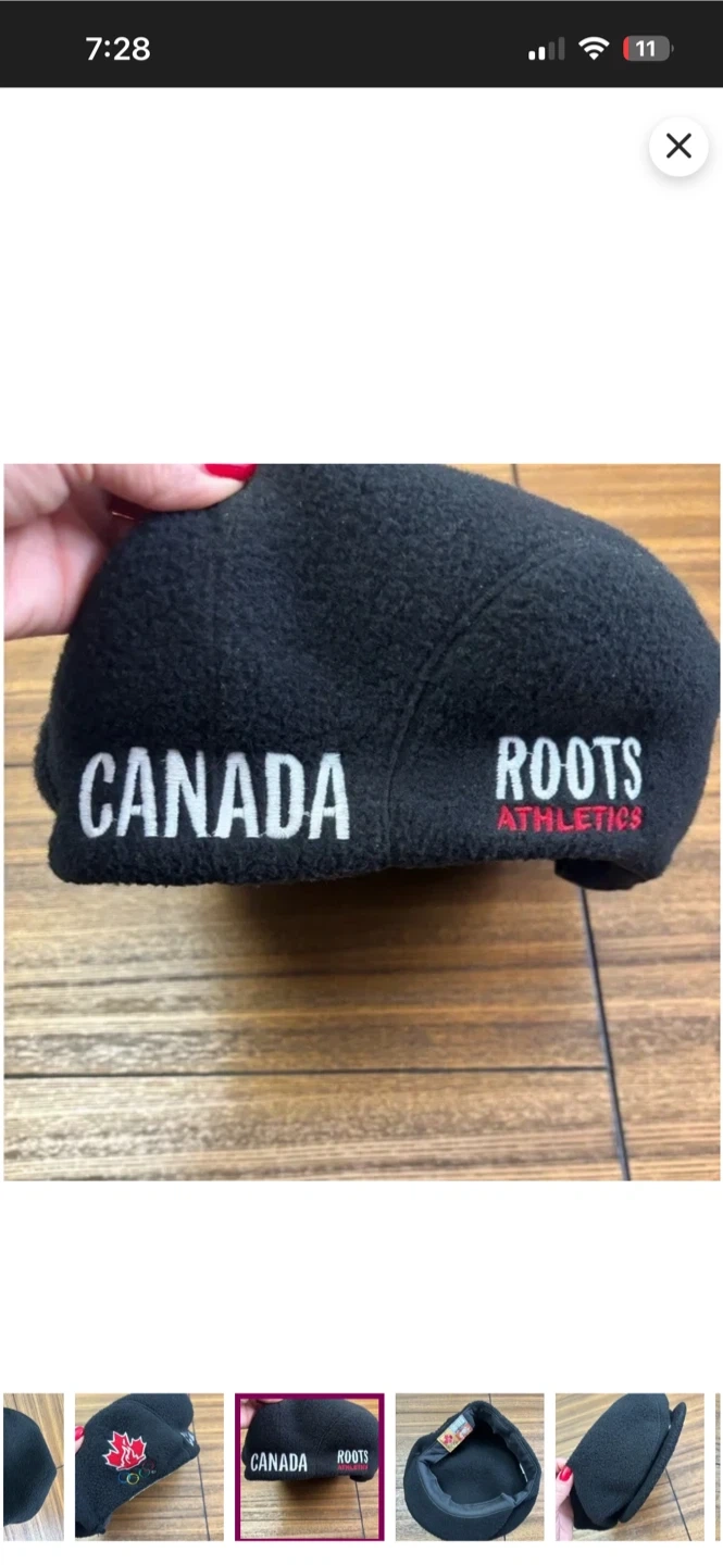 This black fleece beret features "CANADA" embroidered on one side and "ROOTS ATHLETICS" on the other. It also has the Olympic rings logo embroidered. It's made of soft fleece material. Pictures were taken from another ad. My hat has all original tags.