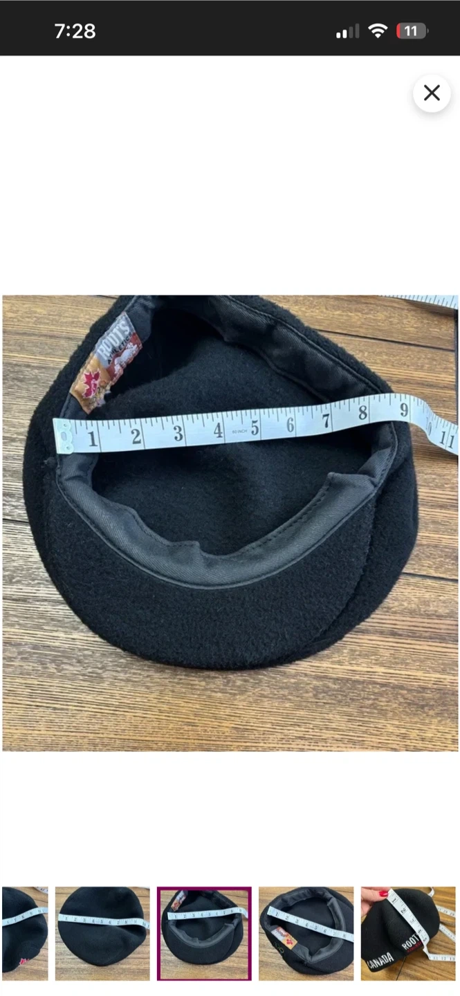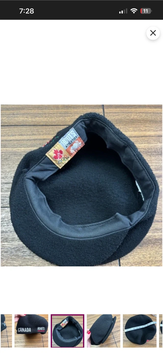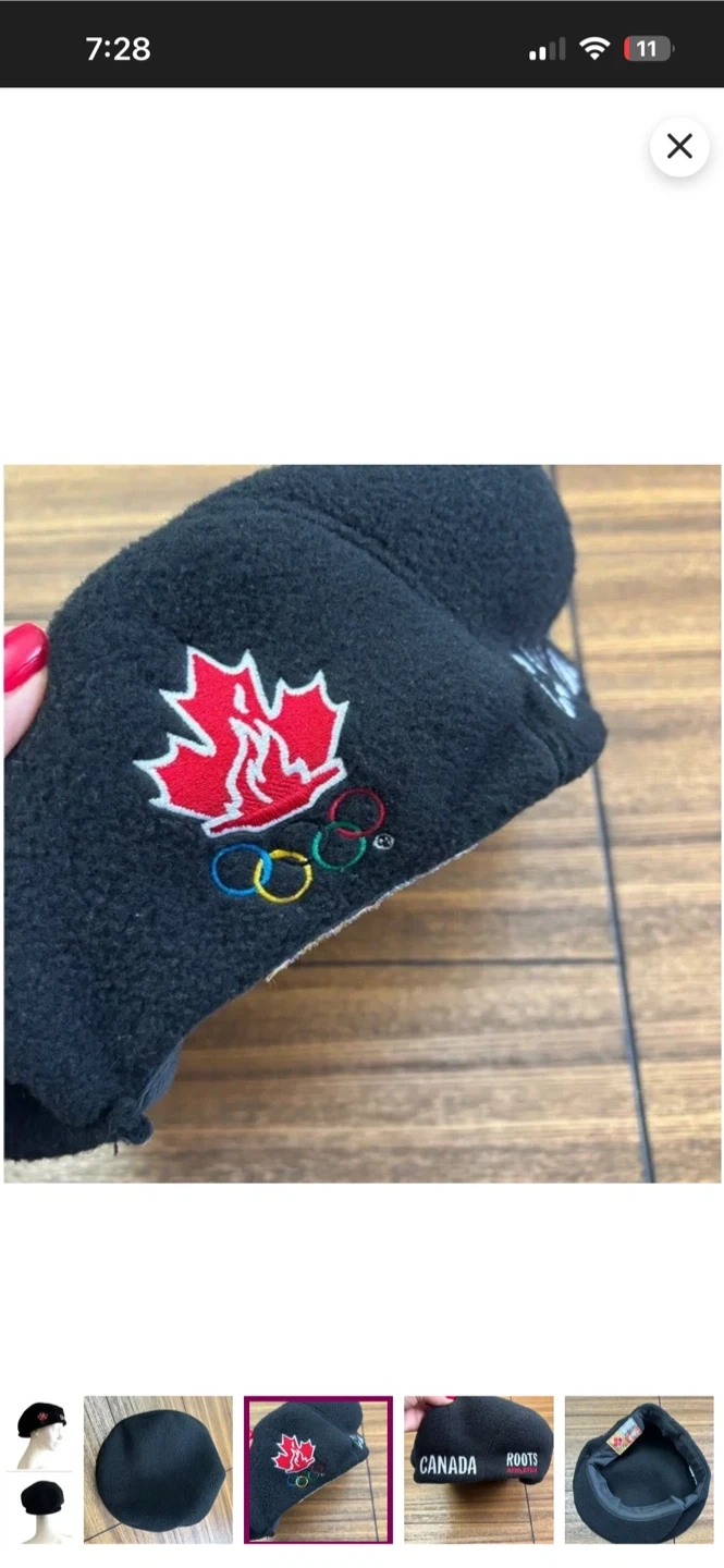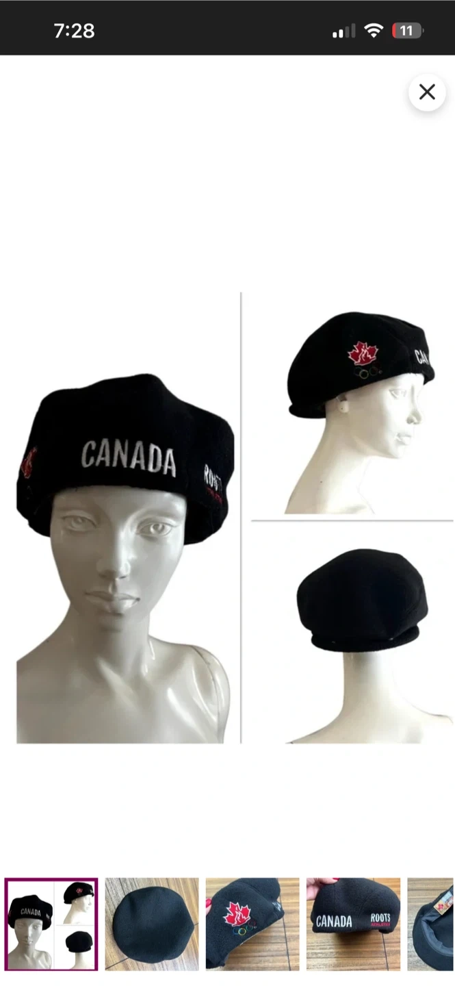 This black fleece beret features "CANADA" embroidered on one side and "ROOTS ATHLETICS" on the other. It also has the Olympic rings logo embroidered. It's made of soft fleece material. Pictures were taken from another ad. My hat has all original tags.