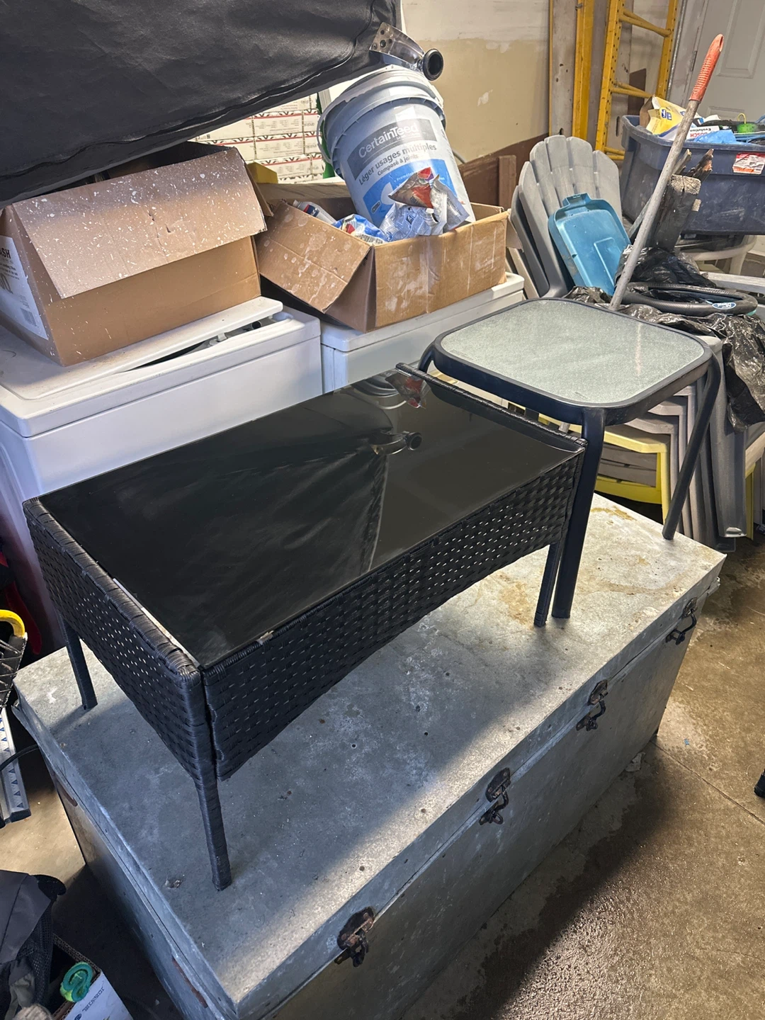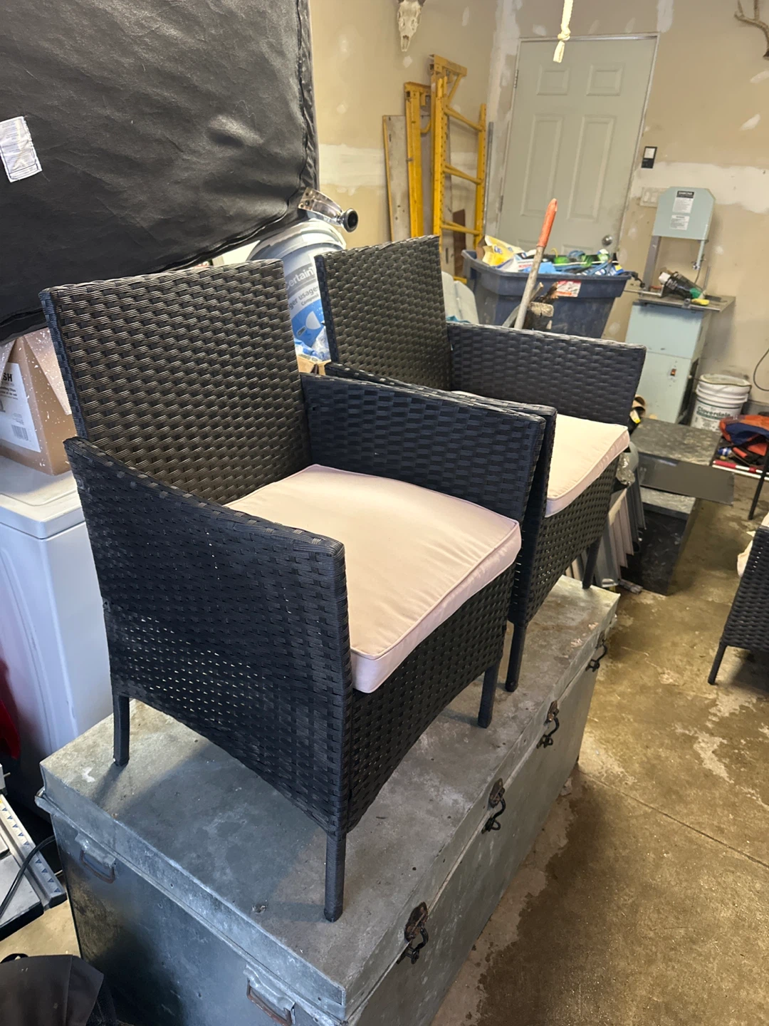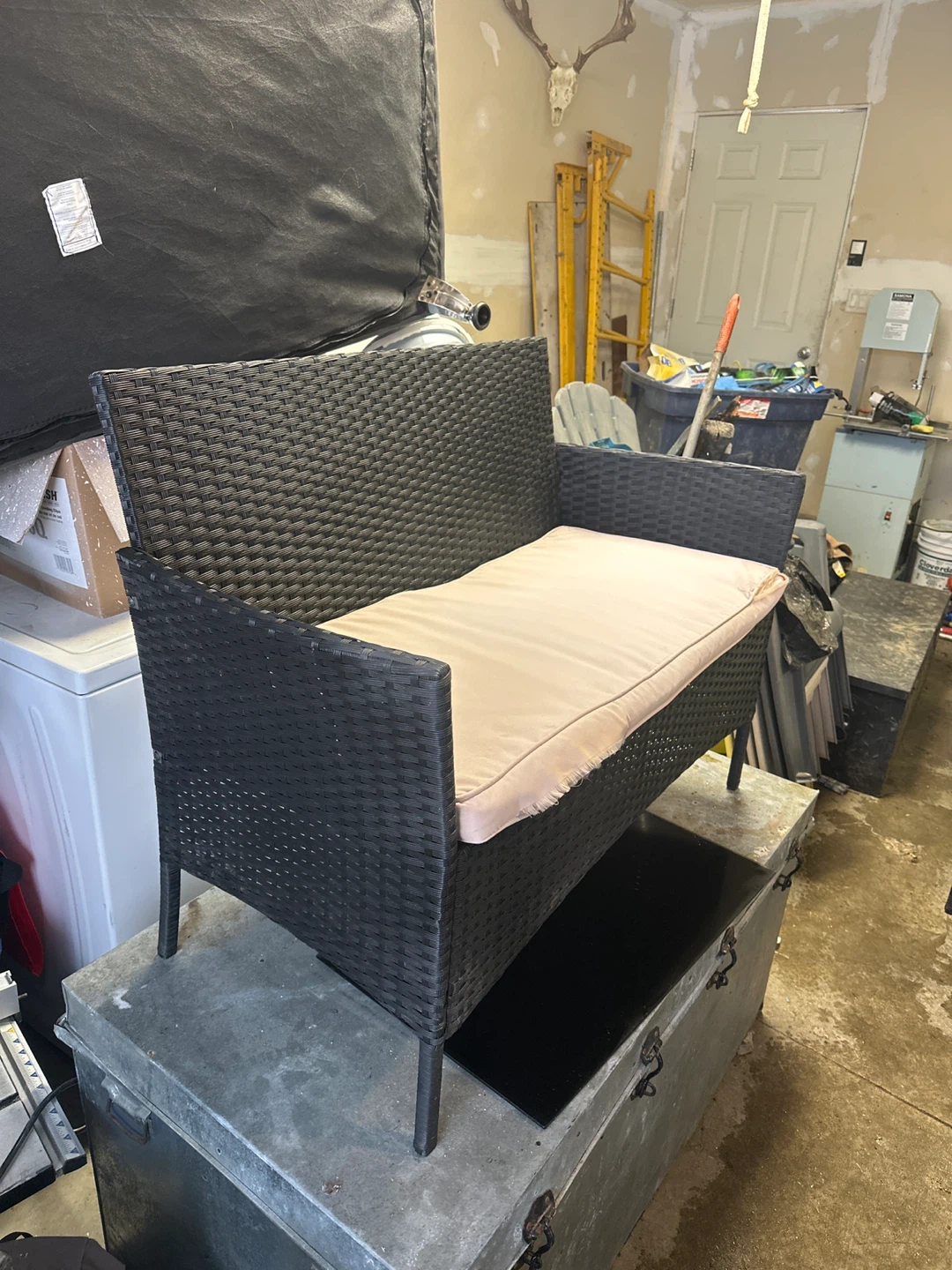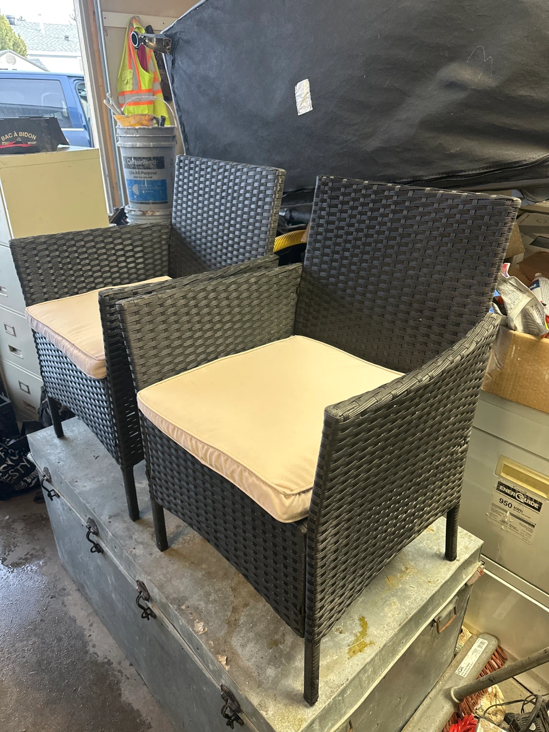 Selling a lovely wicker patio set that includes a loveseat and two chairs. The set is in great condition and perfect for enjoying the outdoors. The cushions are a neutral colour. This set would be a great addition to any backyard or patio!