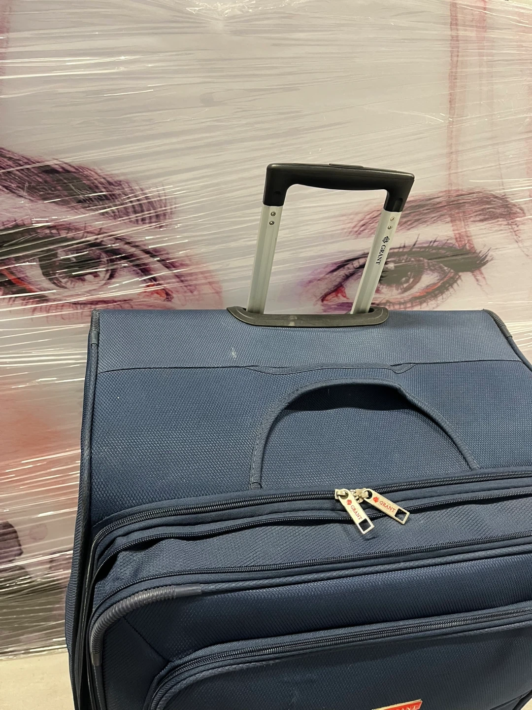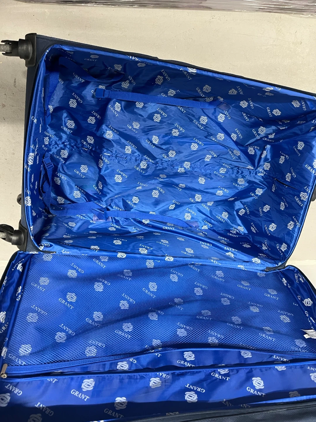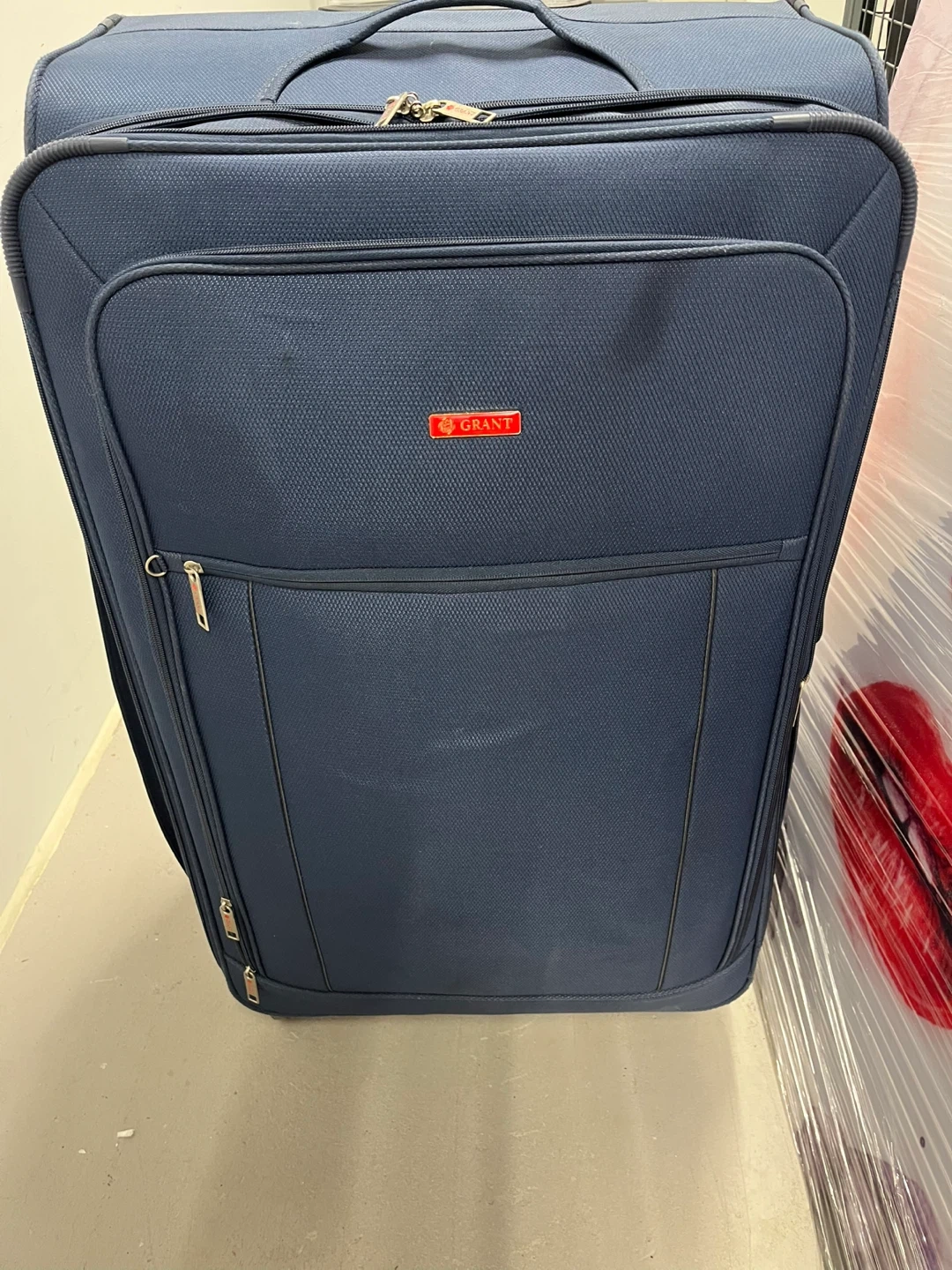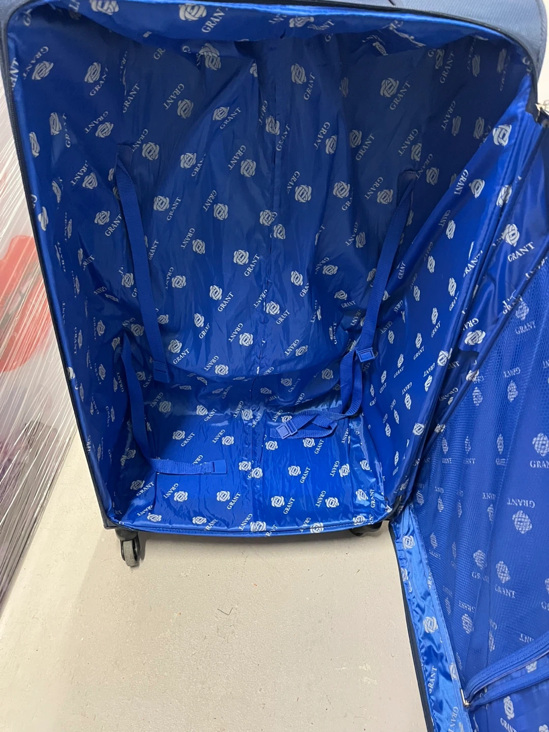 This blue GrantBig luggage features a softside design. It has multiple zippered compartments for organization. Wheels make it easy to transport your belongings.