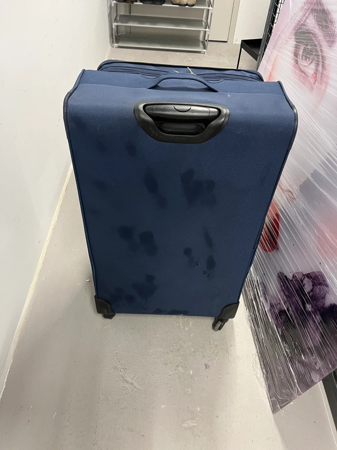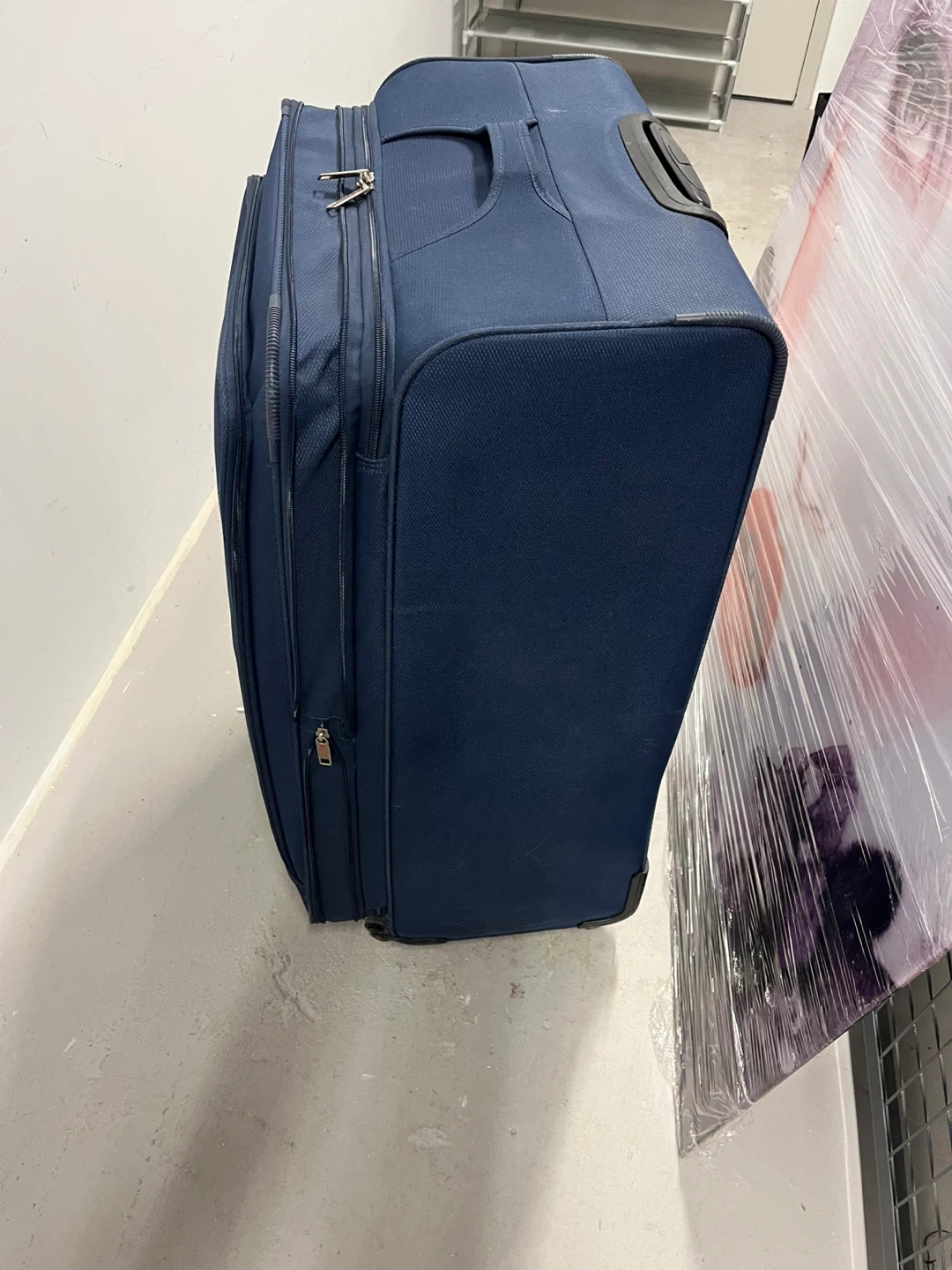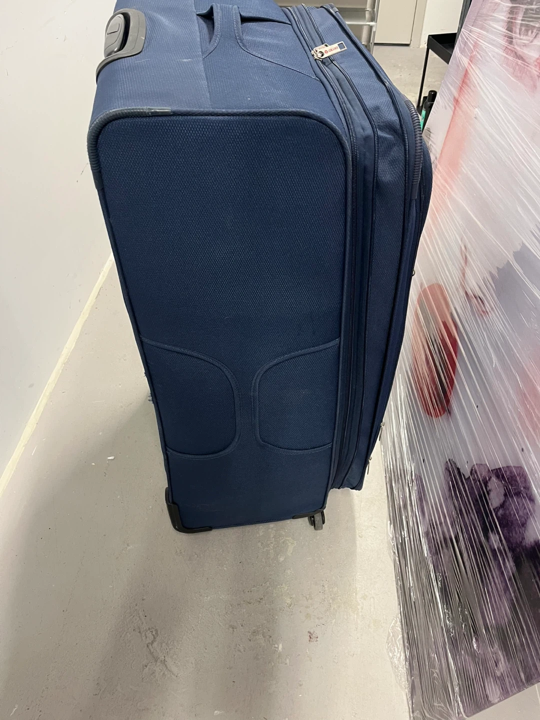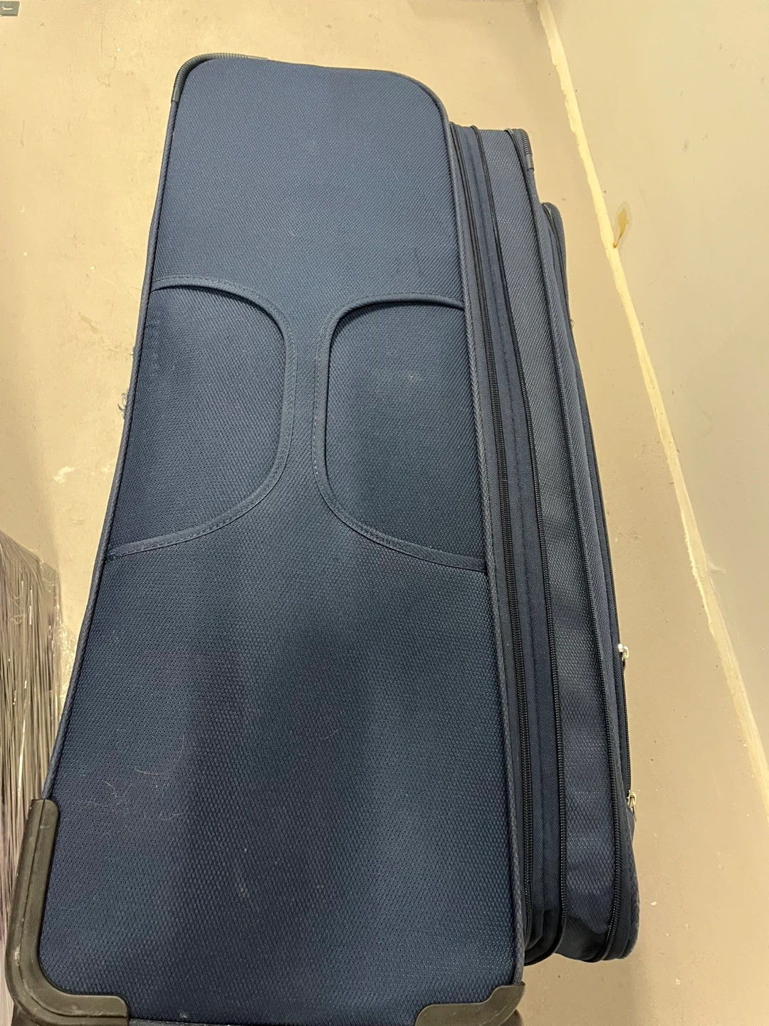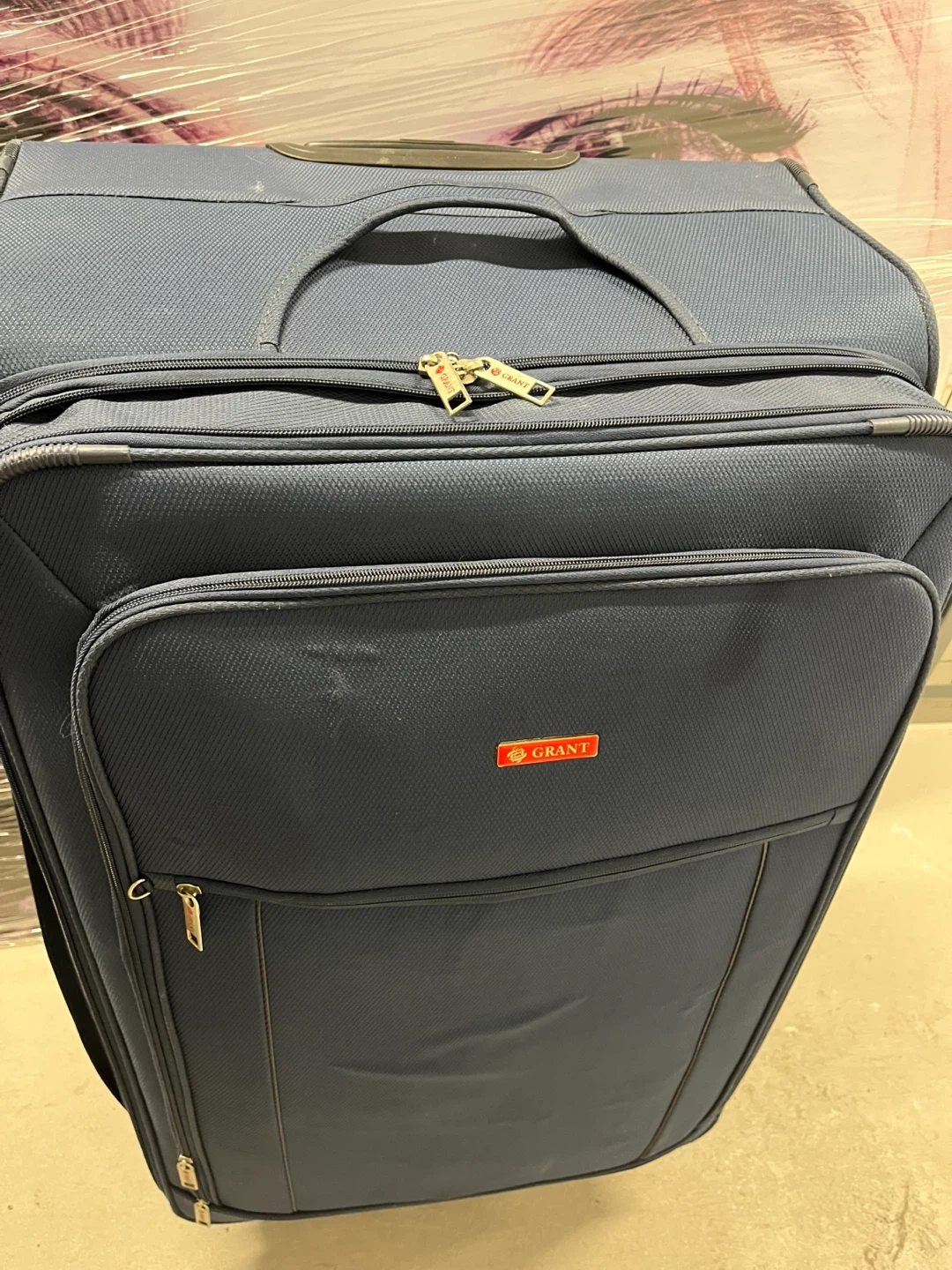 This blue GrantBig luggage features a softside design. It has multiple zippered compartments for organization. Wheels make it easy to transport your belongings.