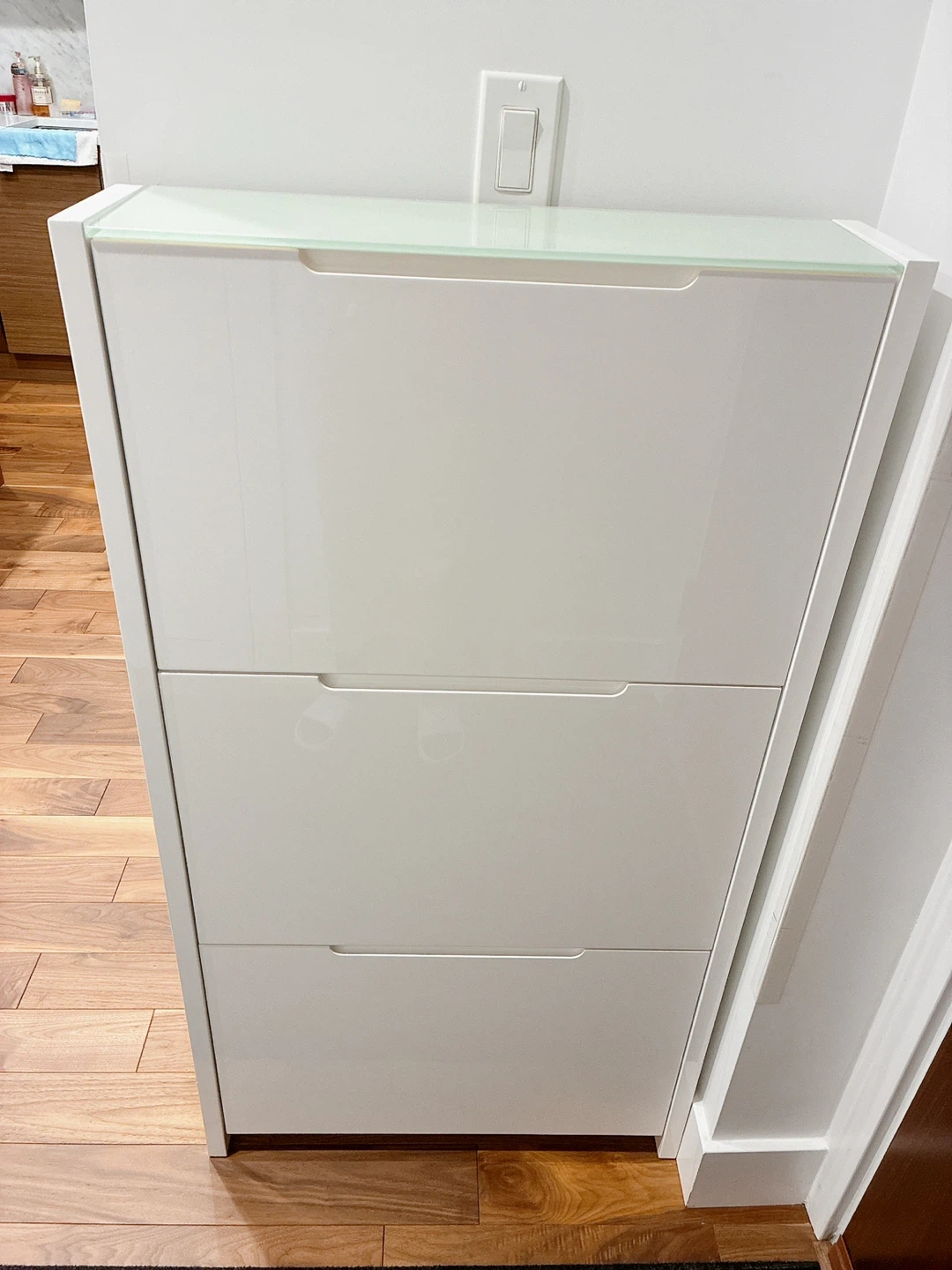 This sleek white shoe cabinet has three flip-out drawers to store your footwear. It's finished with a modern glass top. It's great for keeping hallways tidy!