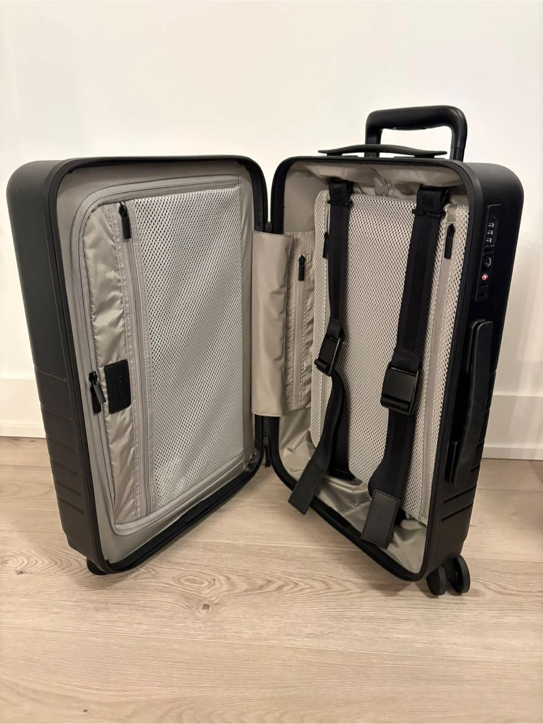 This is a Monos Carry-On Plus suitcase in black. It features a durable polycarbonate shell and a fully lined interior with compression straps and zippered compartments. The interior is designed for organized packing. This carry-on is perfect for weekend trips or as a supplementary bag for longer travels.