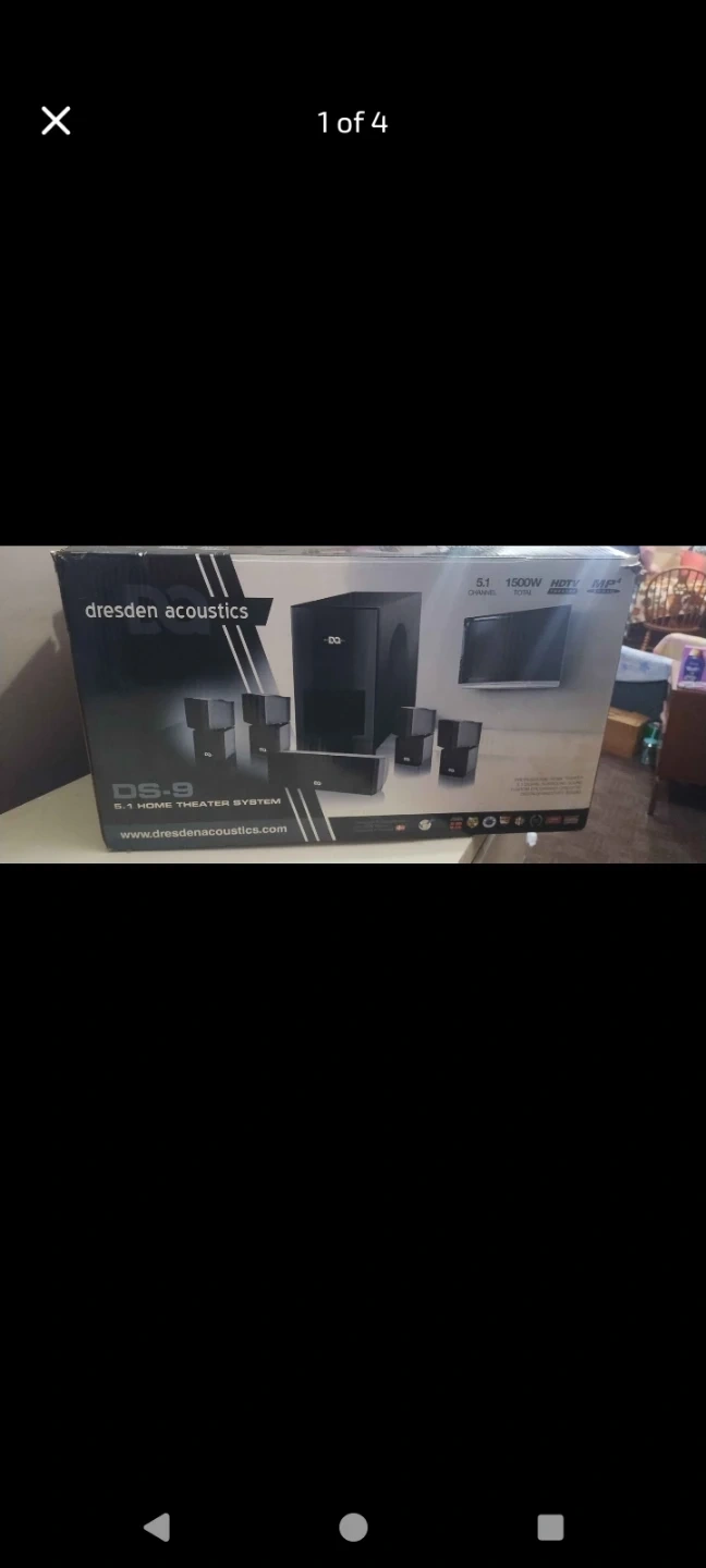 This Dresden Acoustics DS-8 is a 5.1 home theater system with a total power of 1500 Watts. It includes front surround speakers, center speakers, and a subwoofer. The system is MP3, MP4, and HDTV compatible. The subwoofer is a 10-inch unit with 500 Watts output power.