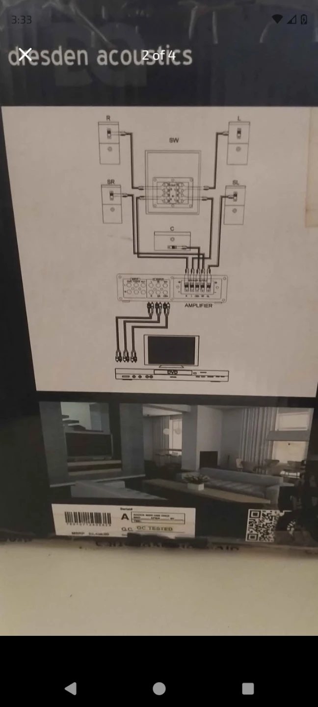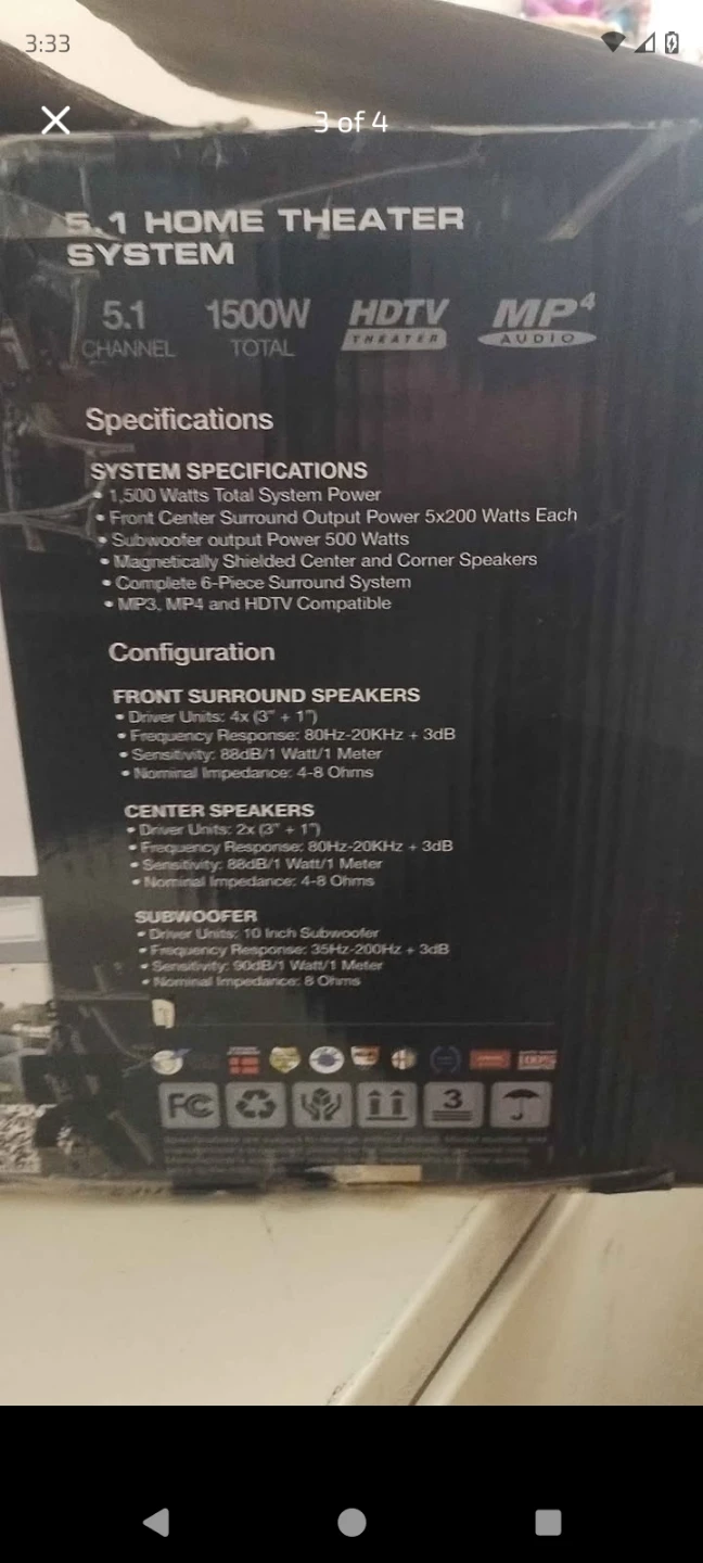 This Dresden Acoustics DS-8 is a 5.1 home theater system with a total power of 1500 Watts. It includes front surround speakers, center speakers, and a subwoofer. The system is MP3, MP4, and HDTV compatible. The subwoofer is a 10-inch unit with 500 Watts output power.