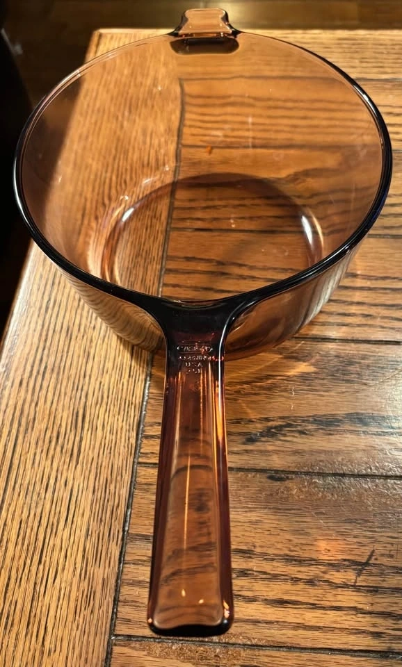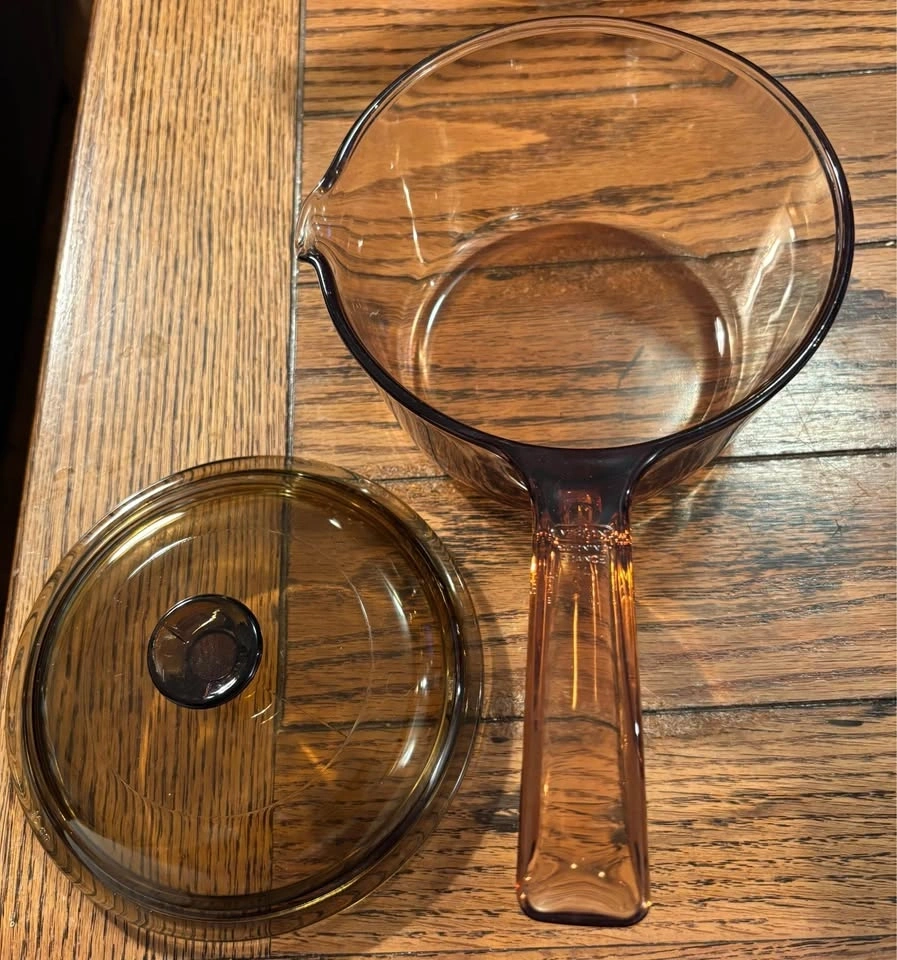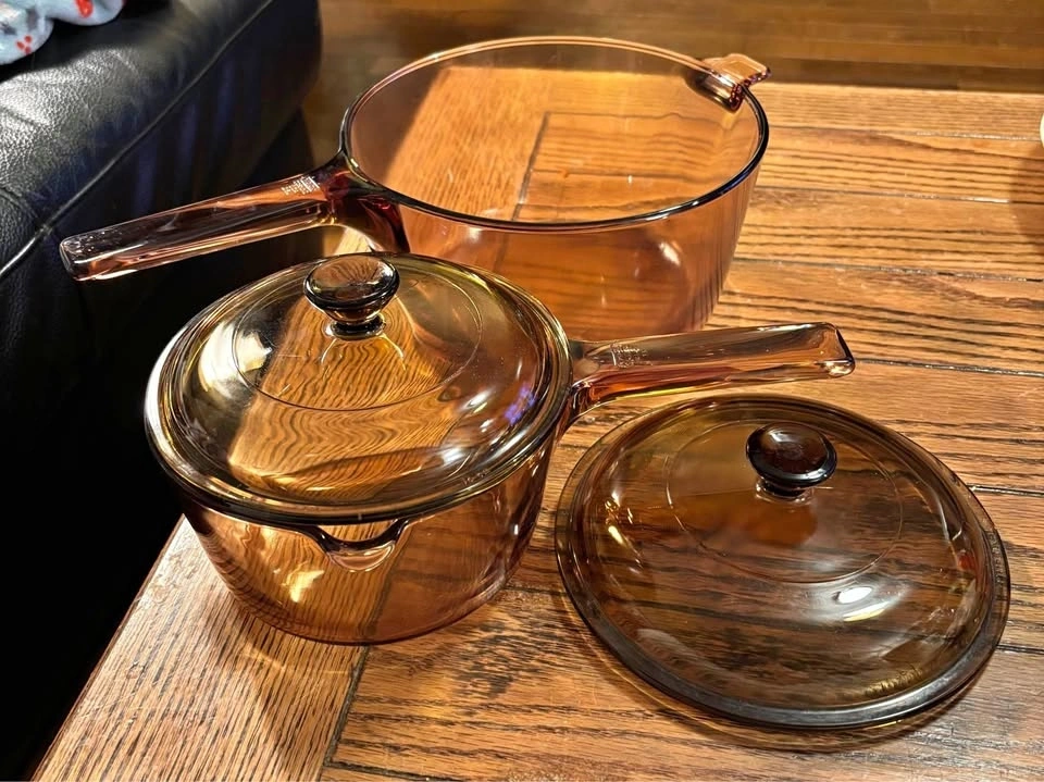 Excellent condition, like new. Corningware Visions clear cookware in Amber. Very heat shock resistant, hardy cookware. Selling together for $80, or can purchase separately. The larger pot is 2.5L with dual handles (no lid). The smaller pot is 1.5L with matching lid. There is also a separate lid, likely for a 2L saucepan. The larger pot is $45, the smaller pot is $40, and the extra lid is $5. No chips or cracks on any items.