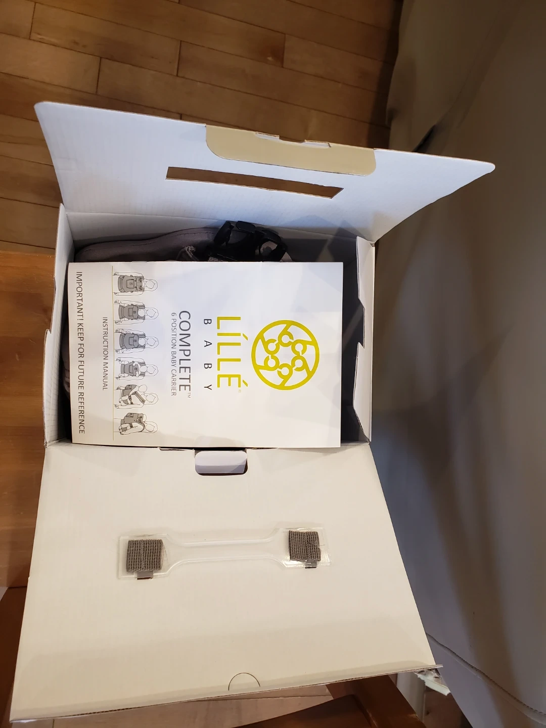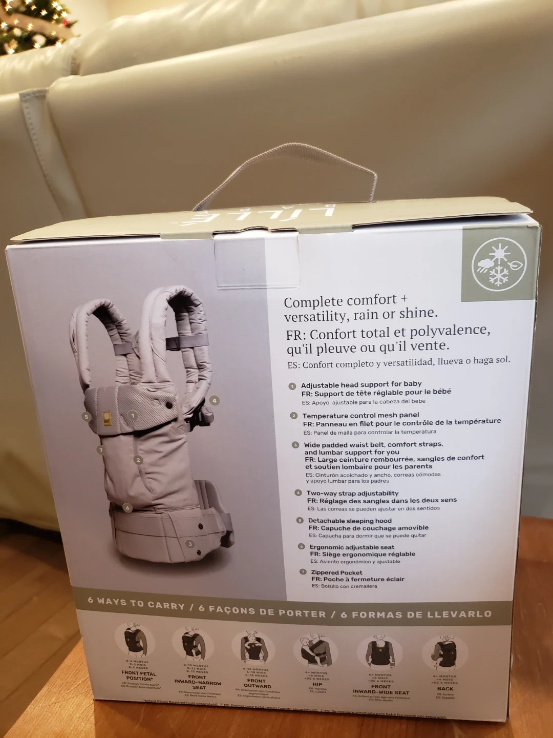 LILLEbaby All Seasons baby carrier in its original box with instruction manual. Features an adjustable head support for baby, a temperature control mesh panel, a sleeping hood, and wide padded waist belt and lumbar support for wearer. Good for newborns to toddlers. Machine-washable, hang-dry.