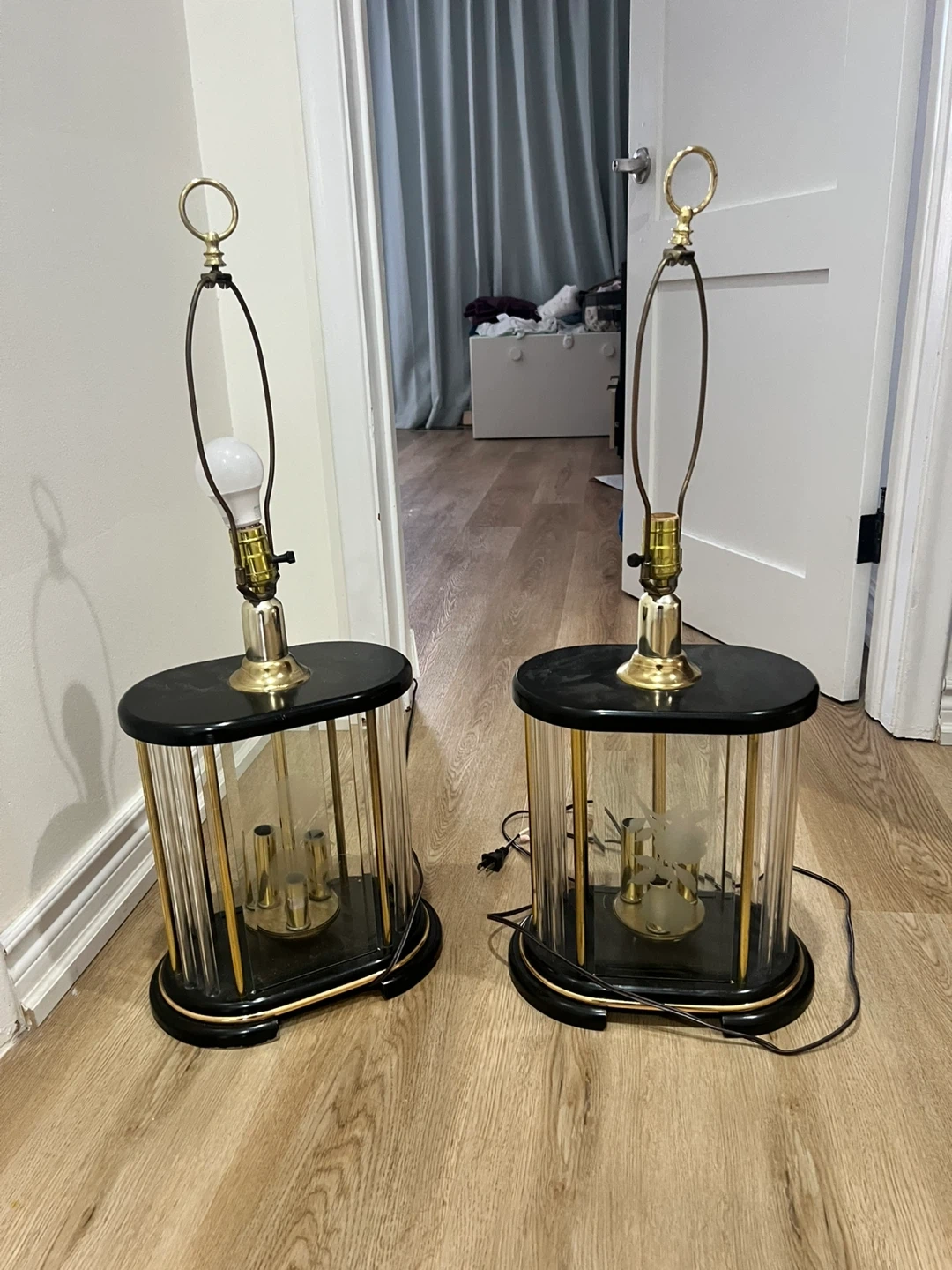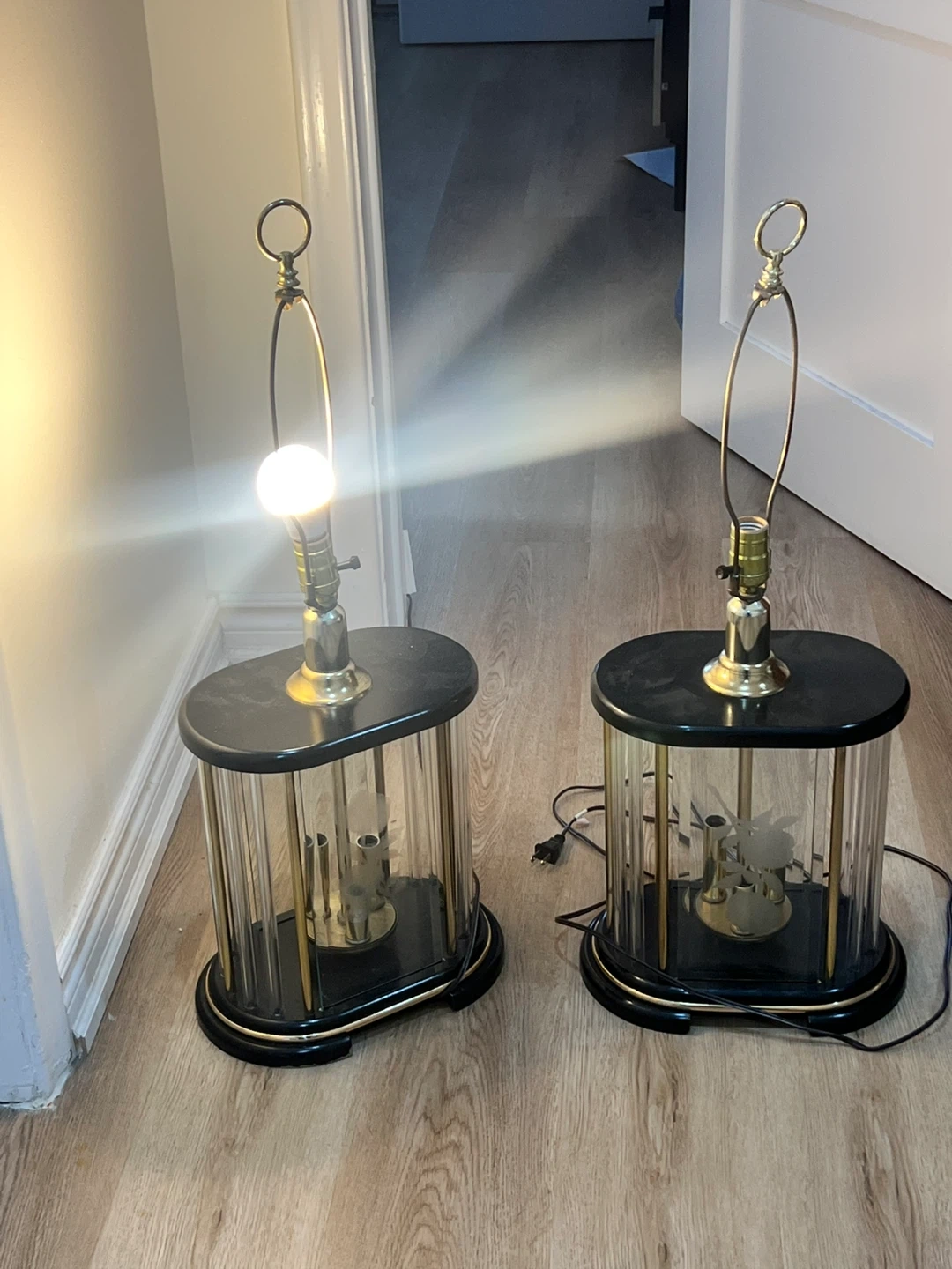 This is a pair of vintage table lamps featuring a black oval base and top with clear ribbed glass cylinders. The lamps have brass accents and a decorative etched floral design inside the glass. They're ideal for adding a touch of retro style to any room.