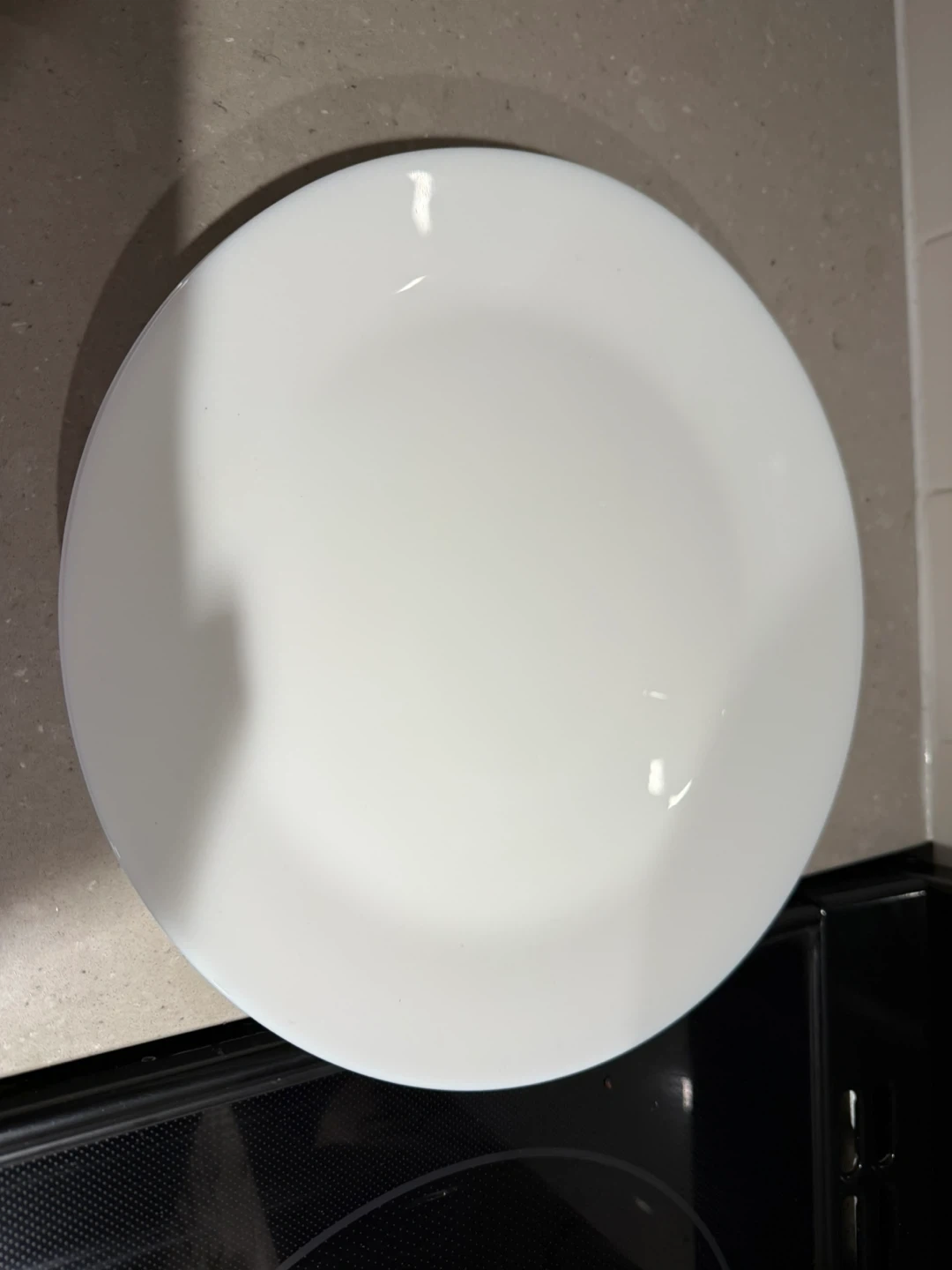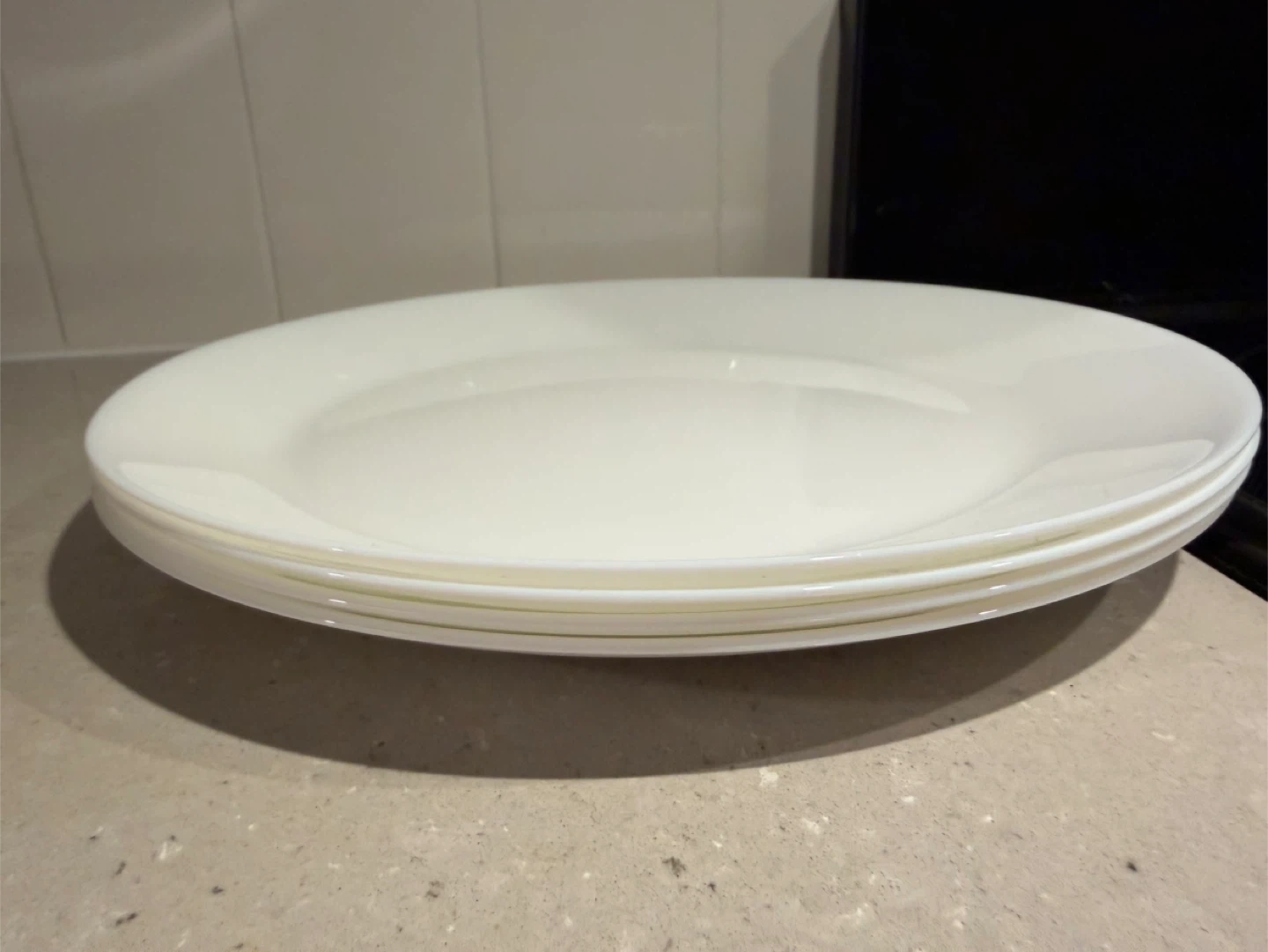 Four white dinner plates. They're a simple, classic design. These plates are a good size for everyday meals. They’d be useful for setting the table for family dinners.