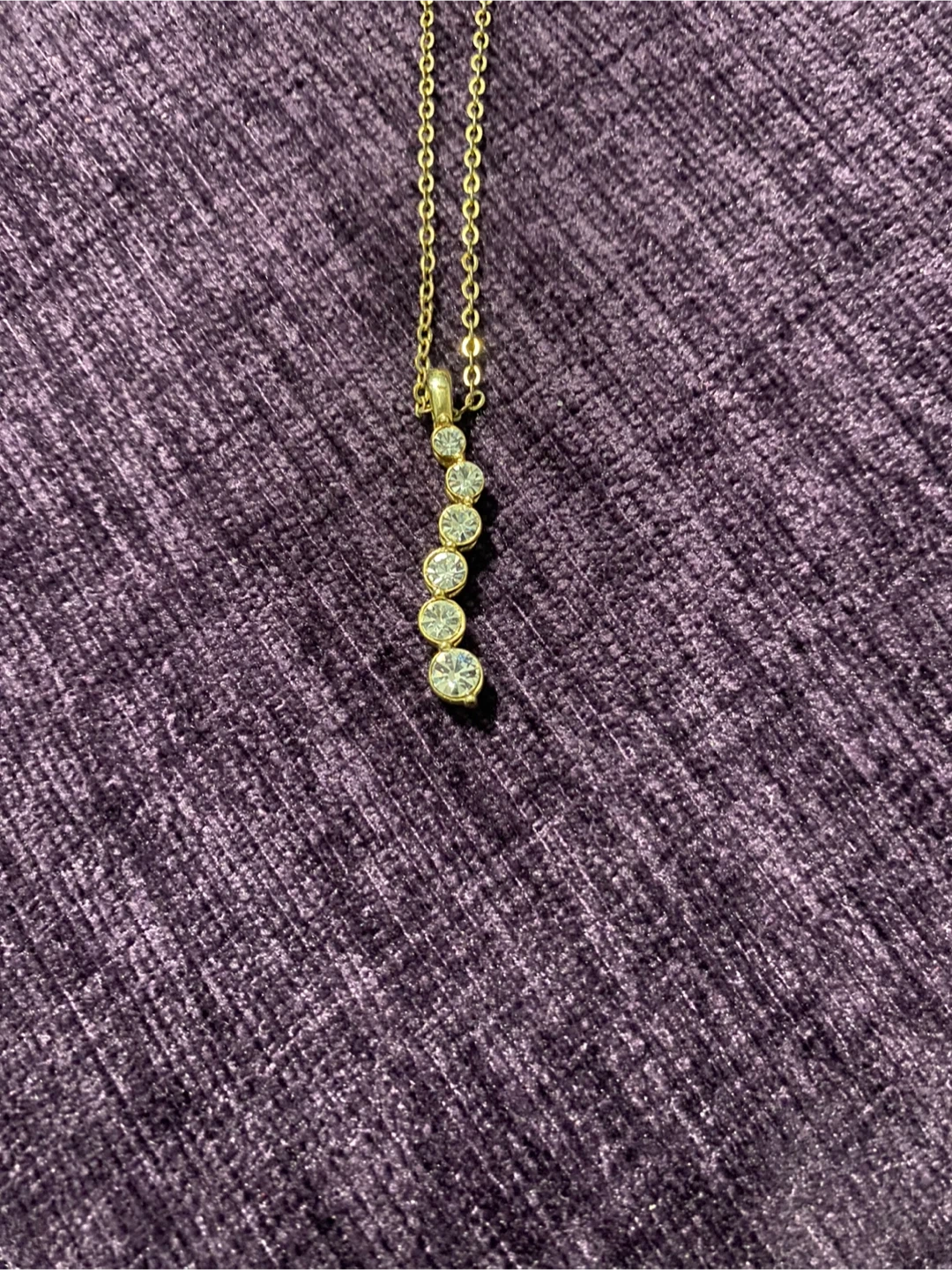 A gold-tone necklace with a delicate chain. It features a pendant with five clear rhinestones arranged in a vertical drop. This piece adds a touch of sparkle to any outfit!
