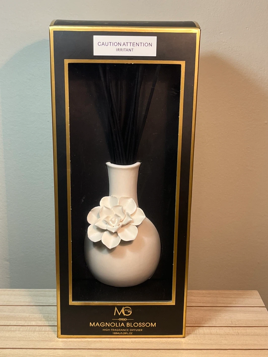 MG Magnolia Blossom reed diffuser offers a high fragrance experience for 75 to 120 days. It includes a ceramic vase, reeds, and a 5.28oz bottle of fragrance oil.