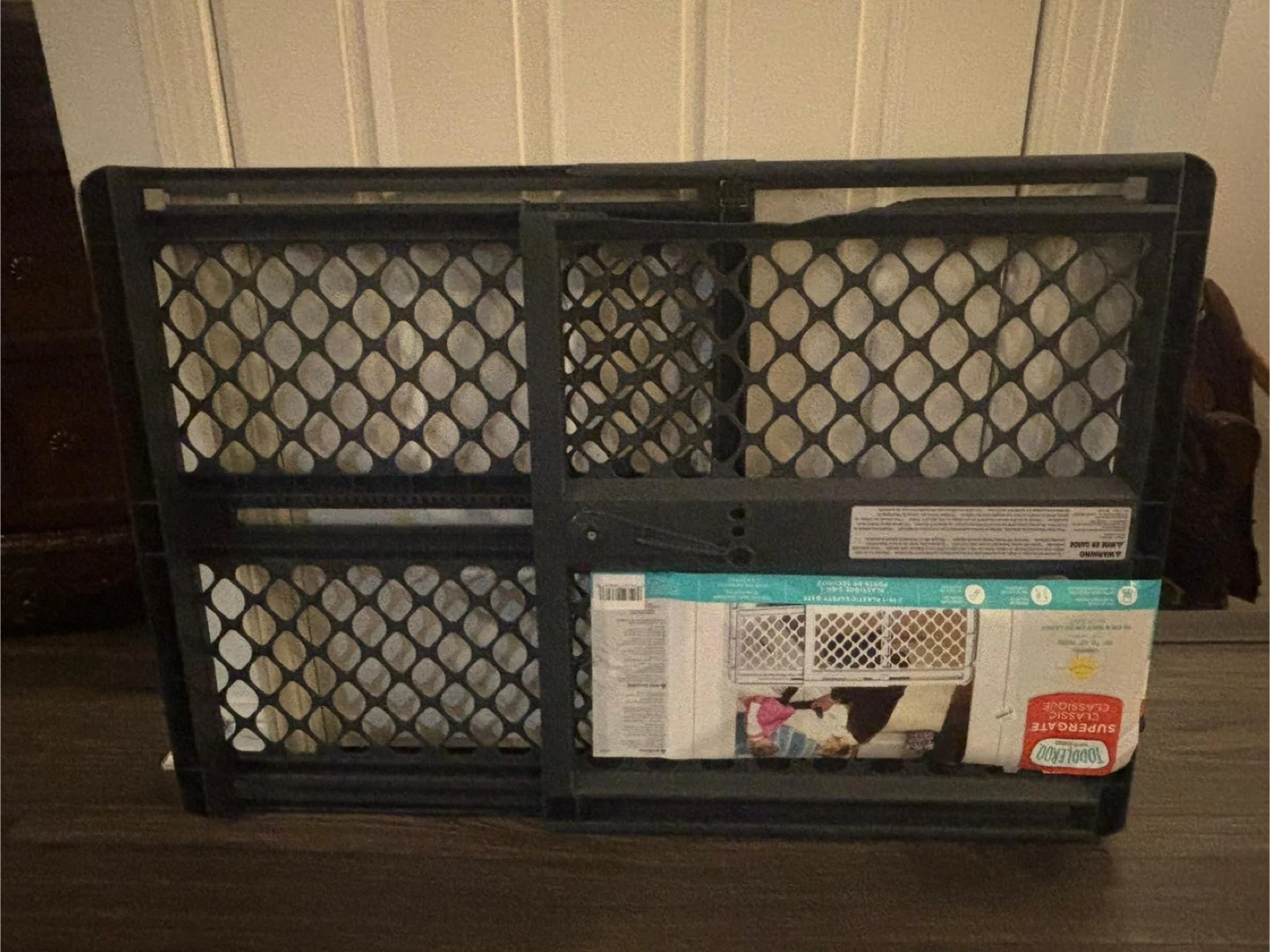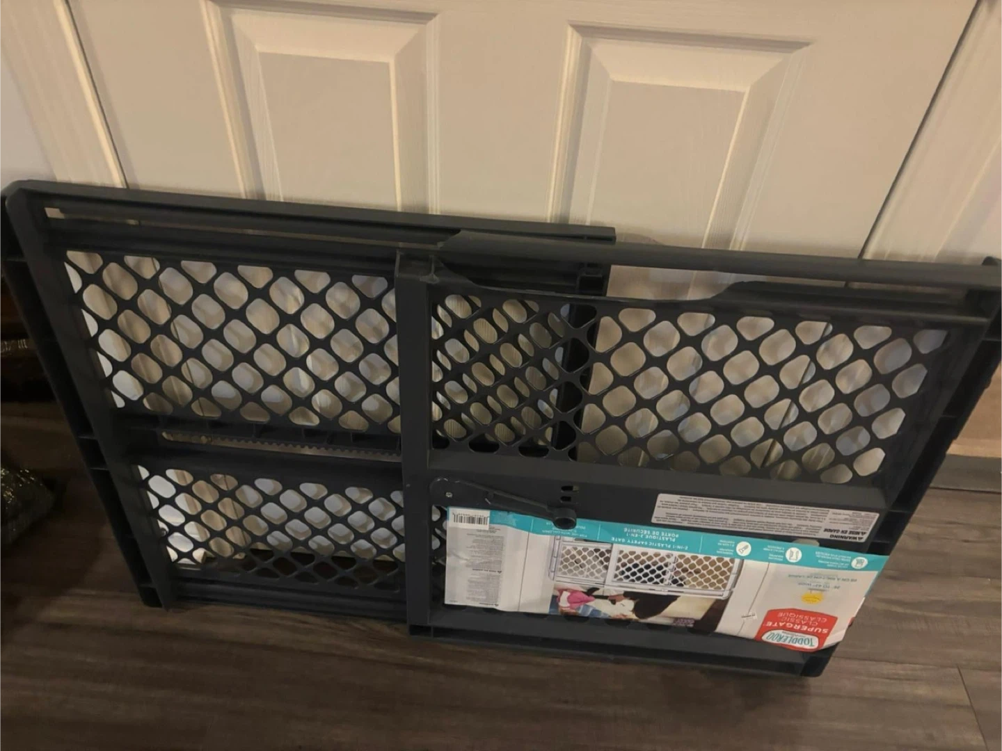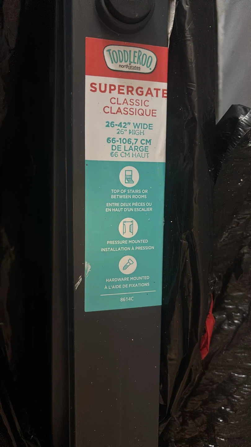 This is a Toddleroo Northstates Supergate Classic in grey. It's 26 inches high and adjustable from 26 to 42 inches wide. Pressure mounted or hardware mounted installation options are available. Instructions for mounting are included.