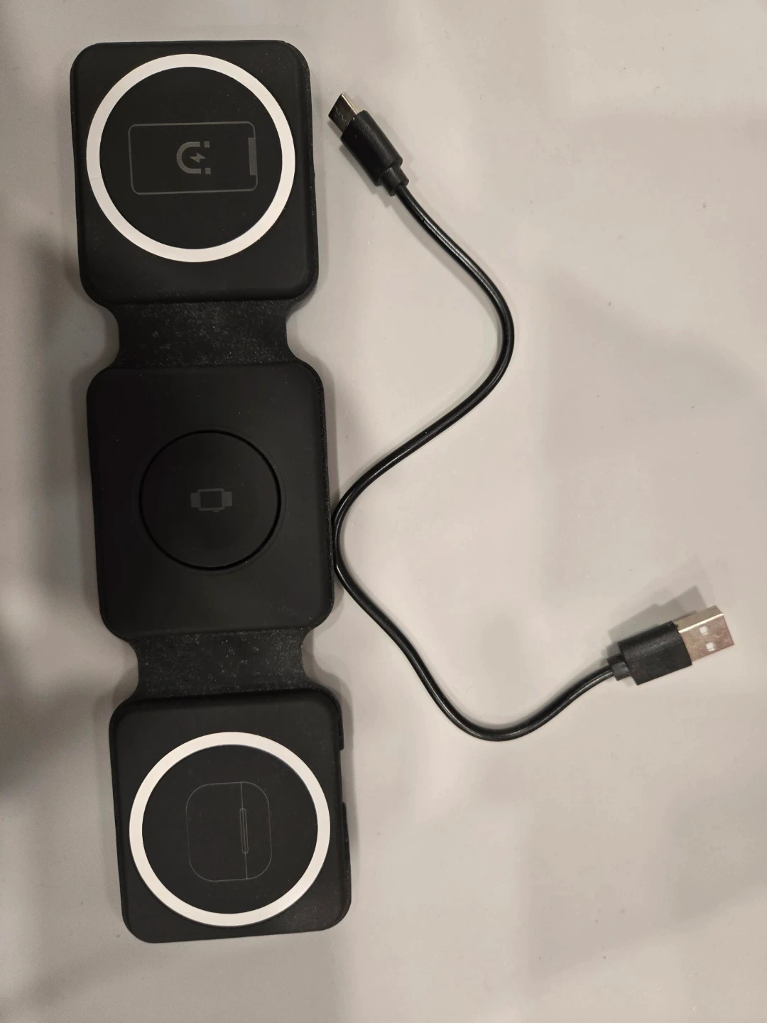 Selling a handy 3-in-1 foldable wireless charger in black! It's perfect for charging your phone, earbuds, and smartwatch all at once. It also comes with its charging cable.