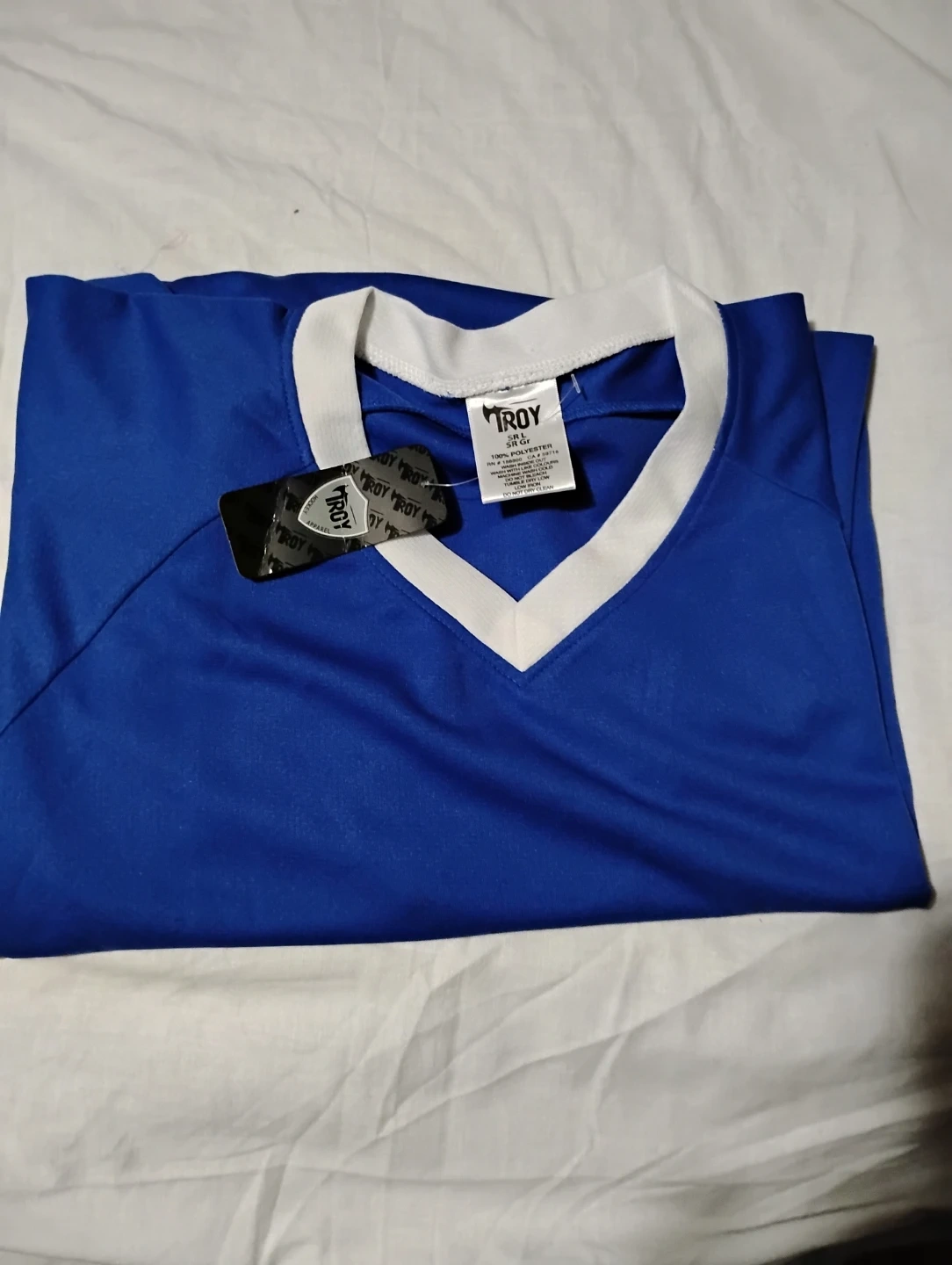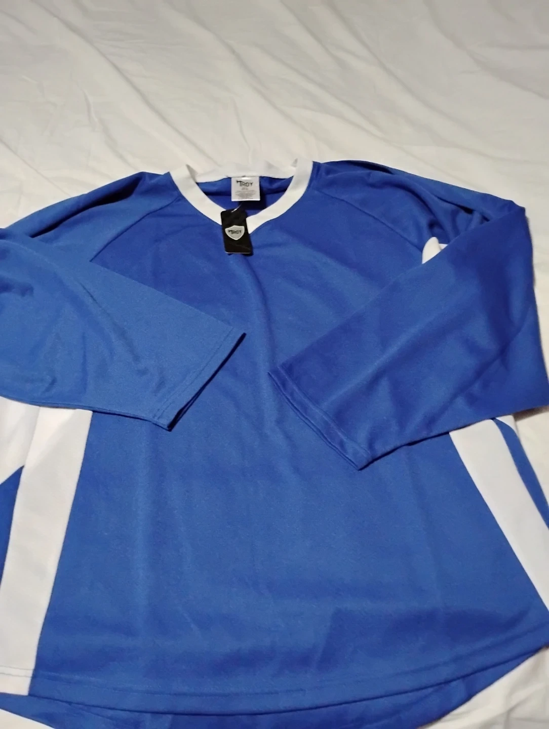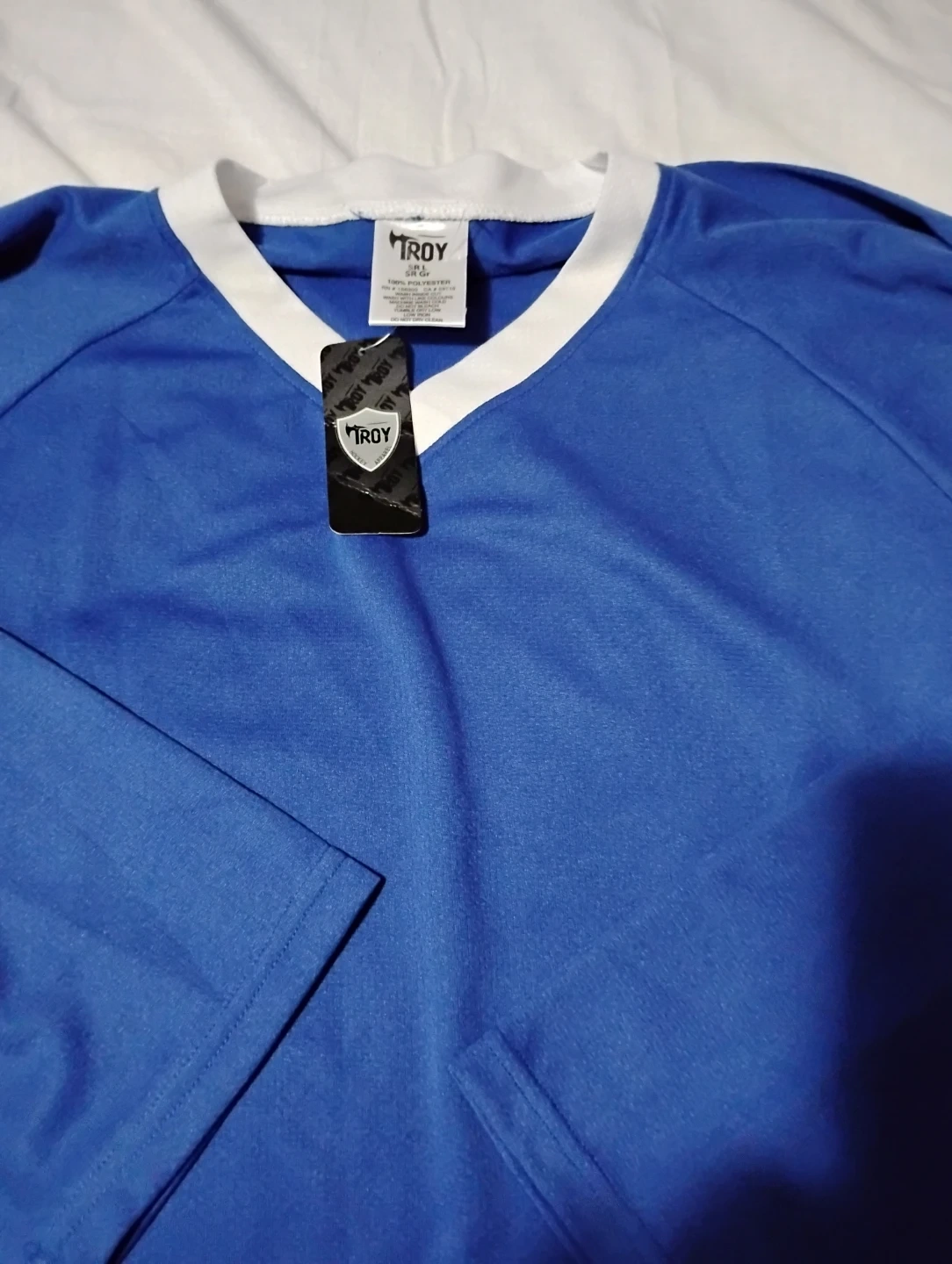 This is a Troy brand long sleeve jersey in blue with white accents. It's made of 100% polyester. Size is L/G.
