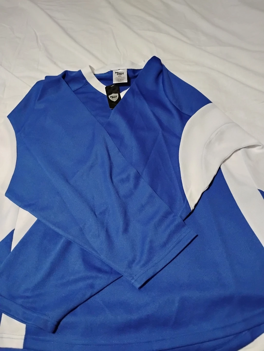 This is a Troy brand long sleeve jersey in blue with white accents. It's made of 100% polyester. Size is L/G.