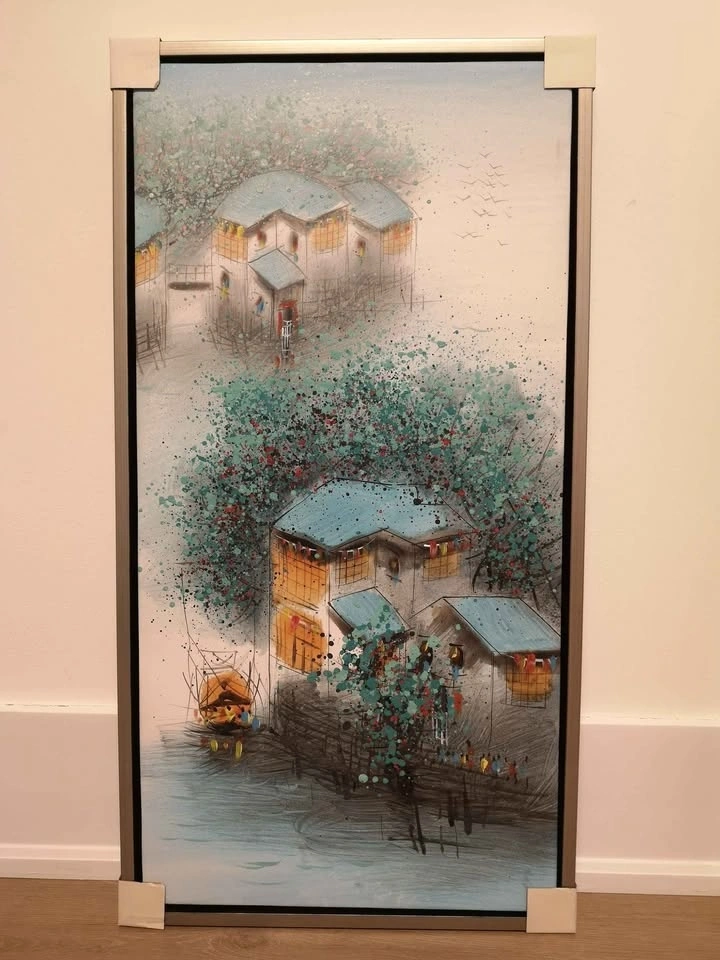Beautiful set of 4 traditional Chinese landscape paintings, representing the Four Seasons. Each artwork is framed. Elegant and timeless pieces, perfect for a living room, hallway, or office. The size of each painting is 17.5 x 33 inches. Never hung, stored carefully. Paintings themselves are in excellent condition with no damage. Only one frame has a small crack on the edge (cosmetic only, doesn't affect the artwork).