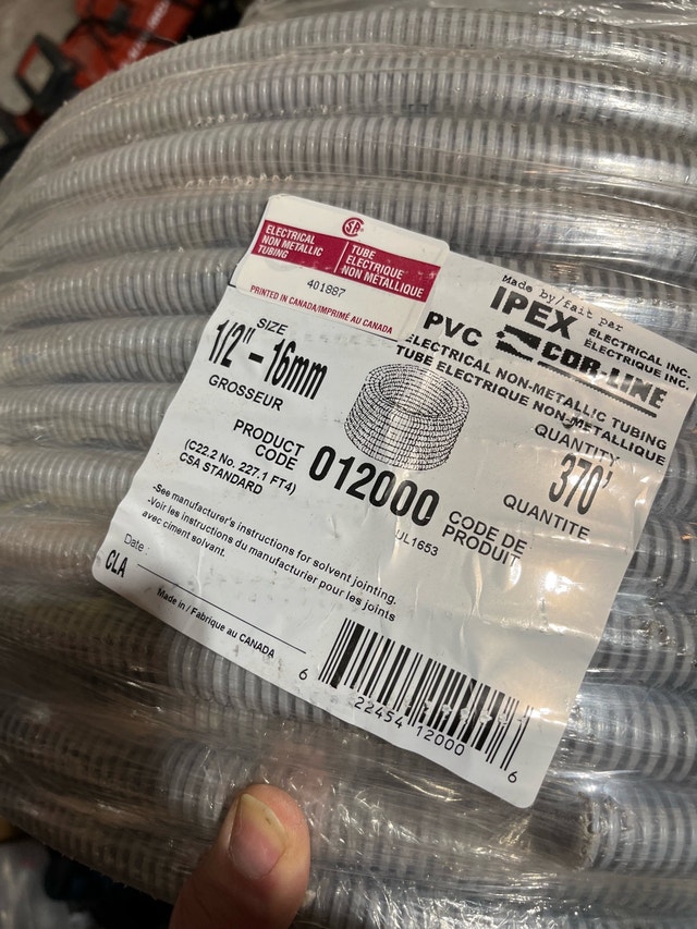 1/2 inch coreline plastic conduit roll. 370 feet with about 40 feet pulled off it. I don’t need the excess. Retails about 240 plus tax. 140 or best offer. Cheers!