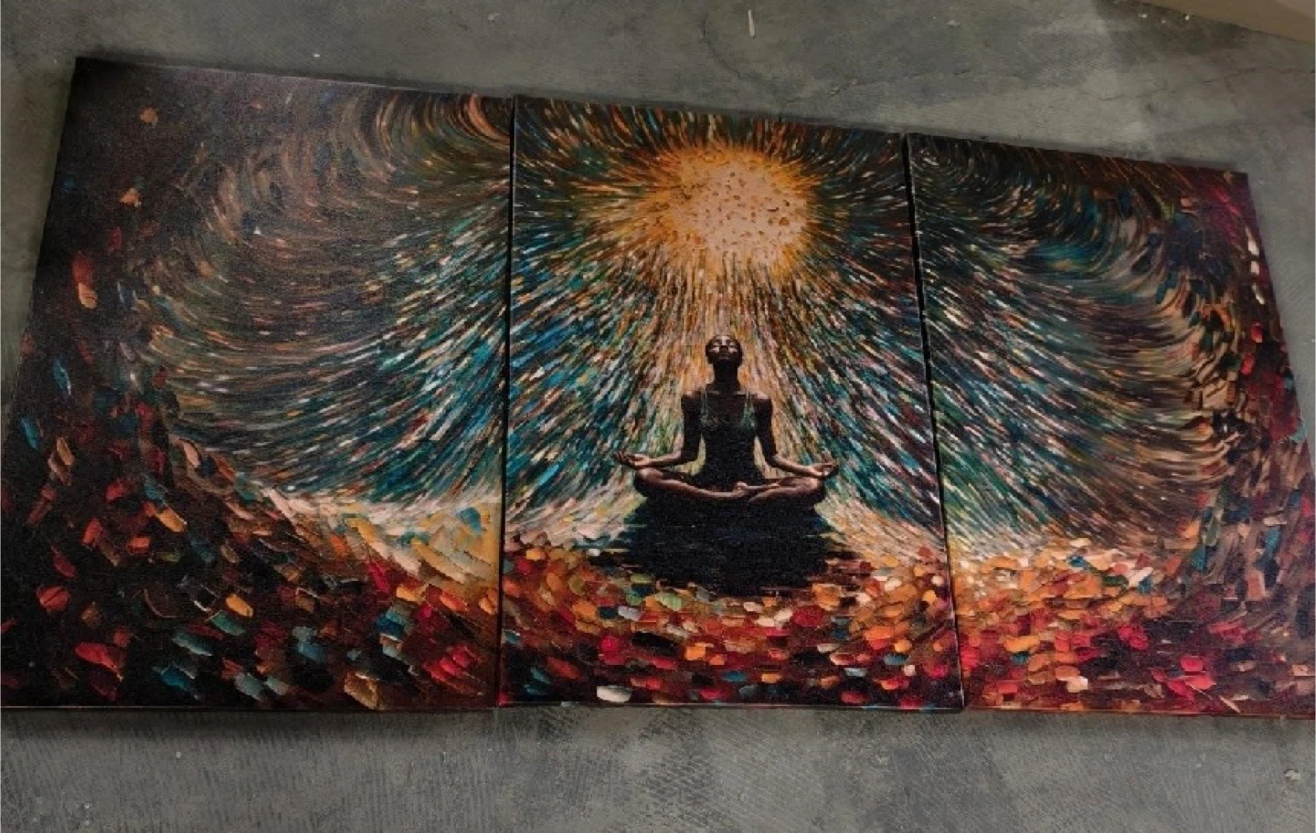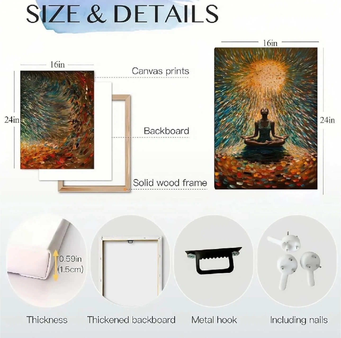 This vibrant canvas print features a person meditating with a bright, energetic background. It's a three-piece set, with each panel measuring 16 inches by 24 inches. The artwork has a solid wood frame and includes a metal hook and nails for easy hanging.