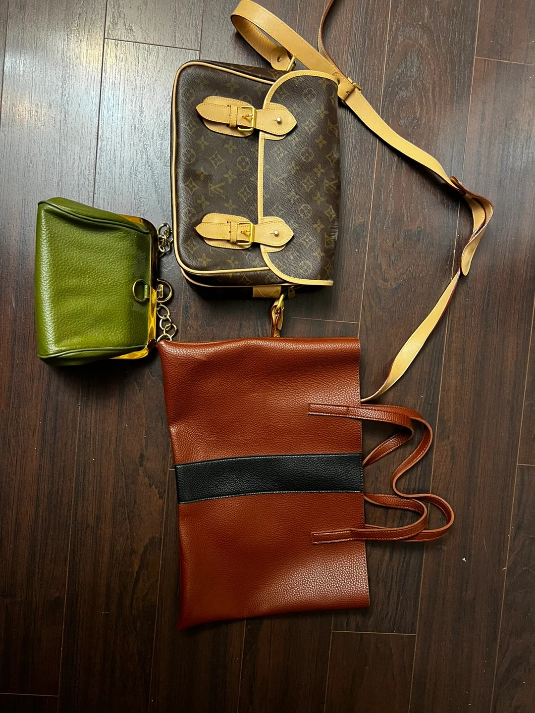 Selling a collection of assorted bags. There is a brown faux Louis Vuitton bag with a shoulder strap, an olive green bag with a chain, and a brown tote bag with a black stripe. All in good condition!