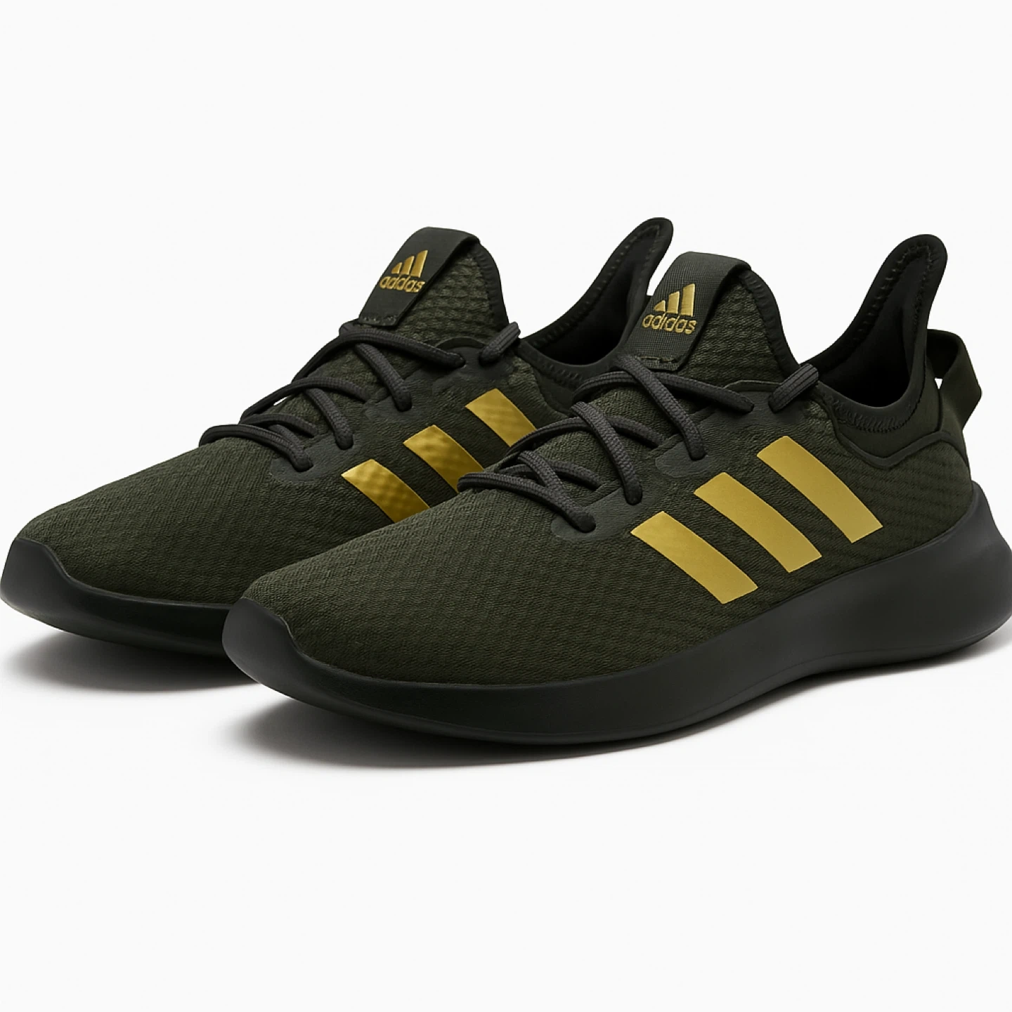 These Adidas running shoes are a stylish olive green with gold accents. They feature a breathable mesh upper and a comfortable Cloudfoam sole. Great for everyday wear or light jogs!
