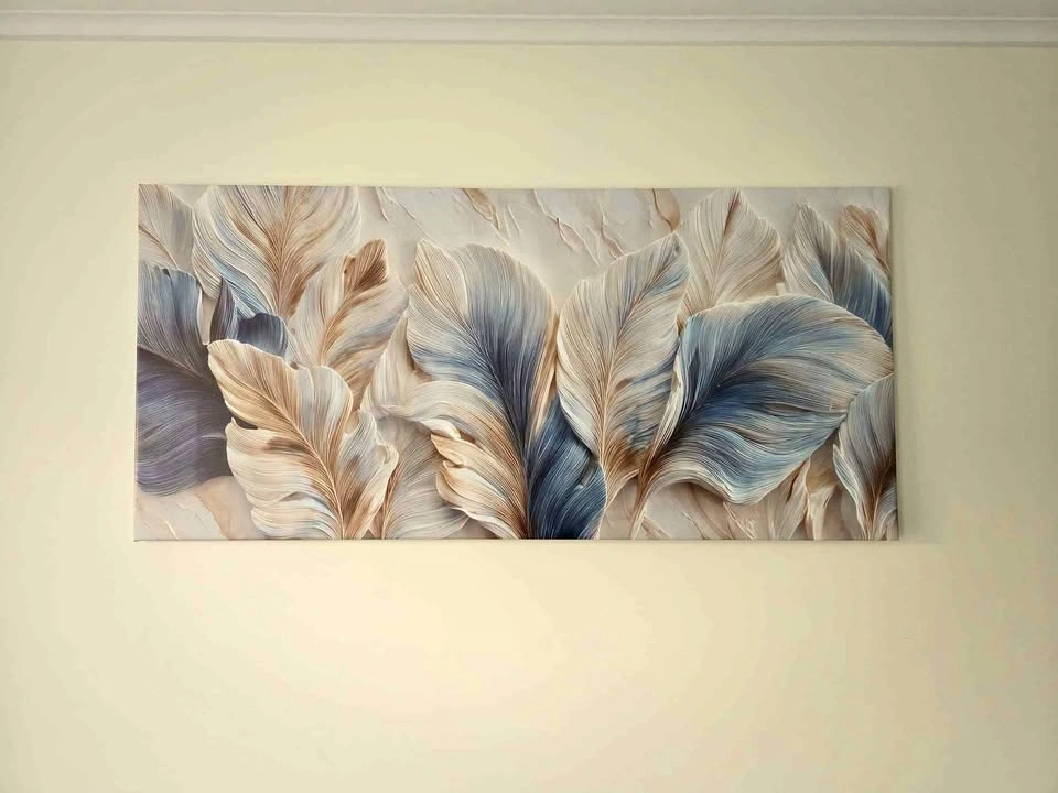 This elegant wall art features softly layered feather forms in calming shades of ivory, beige, and muted blue. The delicate textures and flowing lines create a sense of movement and serenity, making it a refined focal point for any room. Its neutral, contemporary palette blends effortlessly with modern, coastal, and minimalist interiors. Premium printed canvas, ready to hang – no framing needed. Large horizontal statement piece with soft, calming colours that brightens up any room without overpowering it. Perfect for living rooms, bedrooms, or hallways, this piece brings a soothing and sophisticated touch to your space.