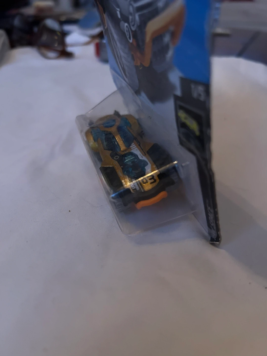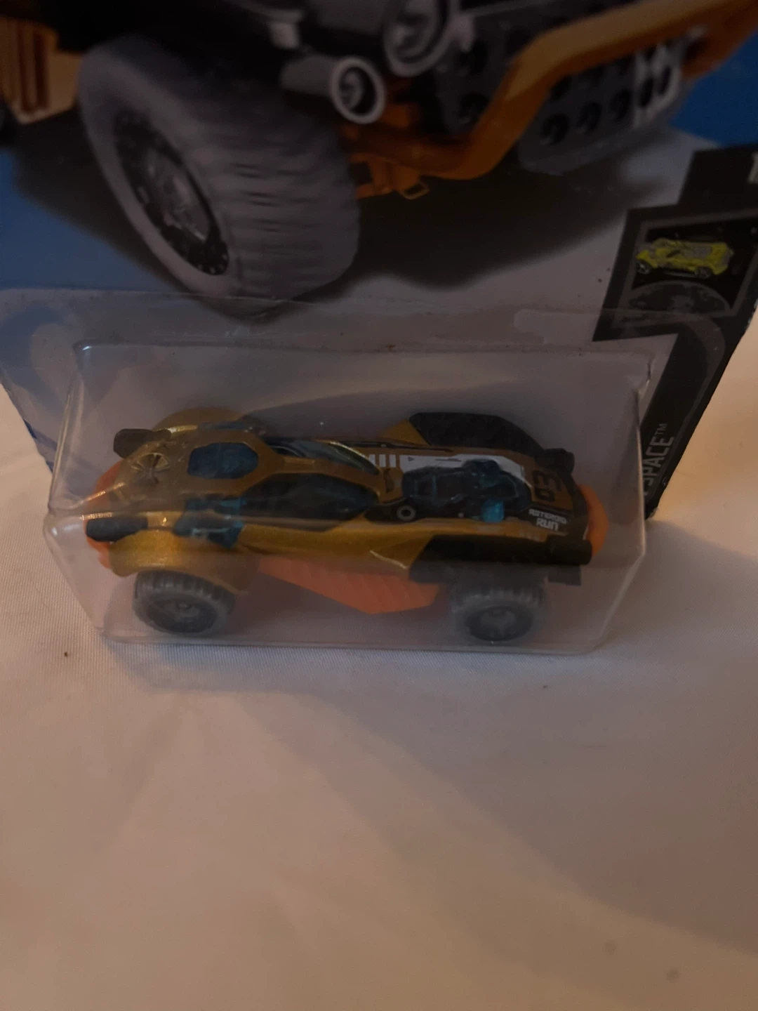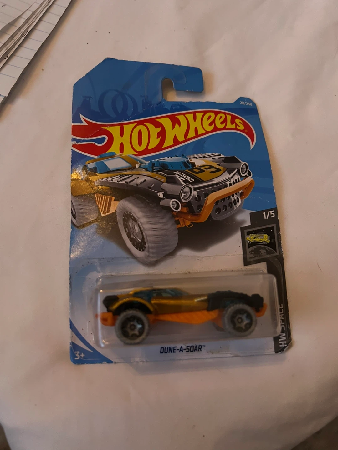 This is a new Hot Wheels Dune-A-Soar toy car in its original packaging. It's orange and gold with blue accents. Recommended for ages 3 and up.Package has some wear