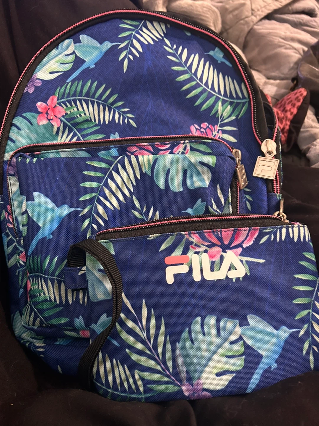 This Fila mini backpack features a vibrant tropical floral print with hummingbirds. It's blue with pink trim and includes a matching front pouch. Great for everyday use!