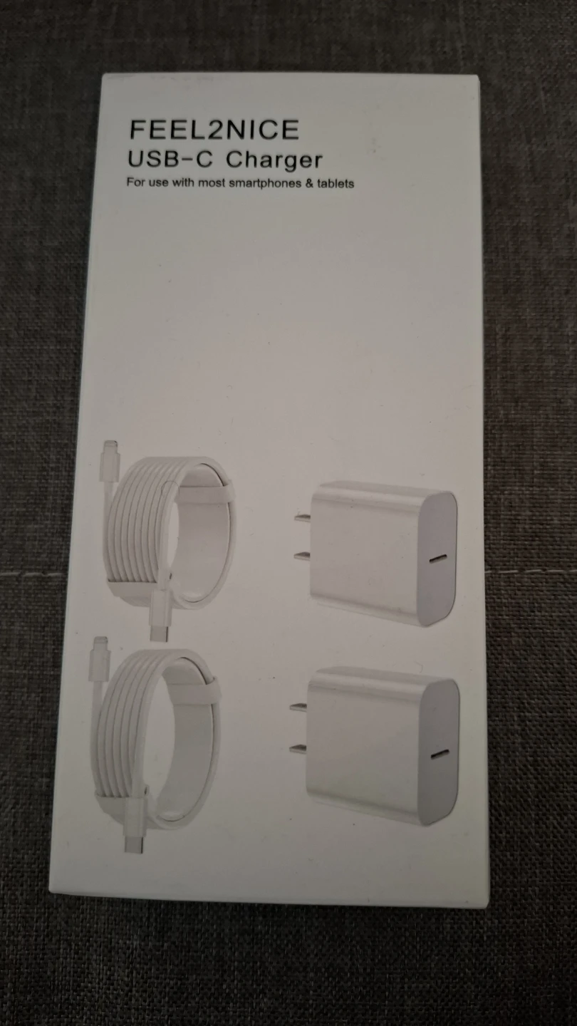 FEEL2NICE USB-C charger set. Includes two white charging bricks and two white USB-C cables. For use with most smartphones, tablets. IPhone charger ax/XR/X,AirPods Pro.