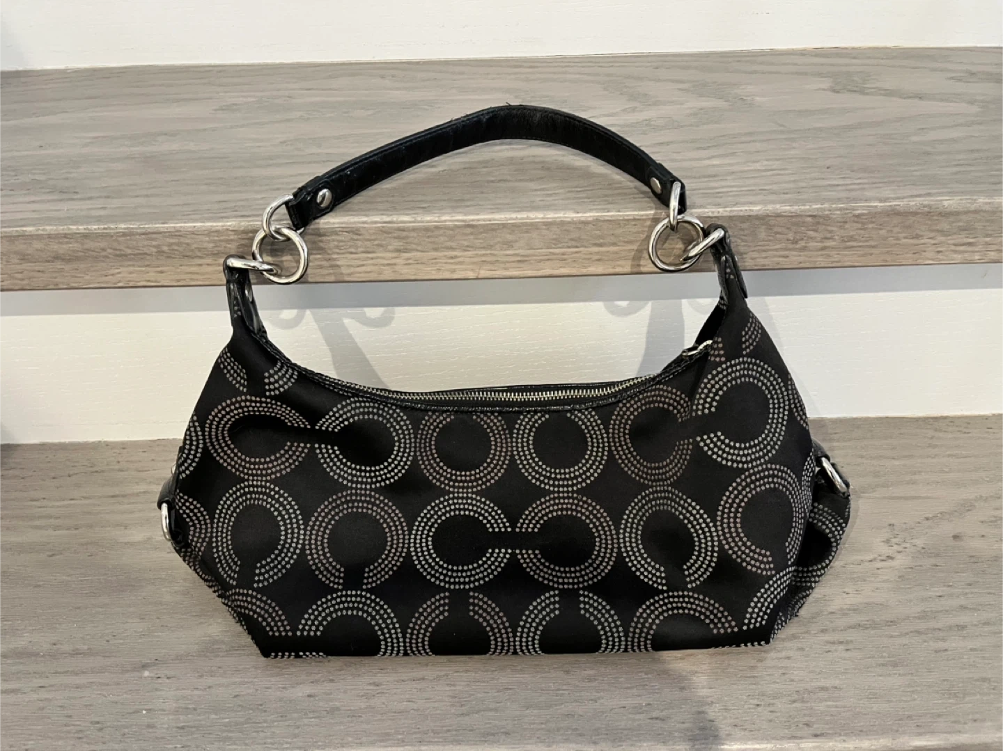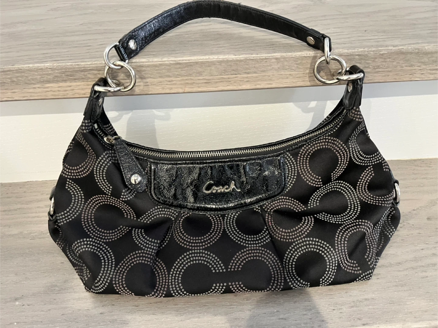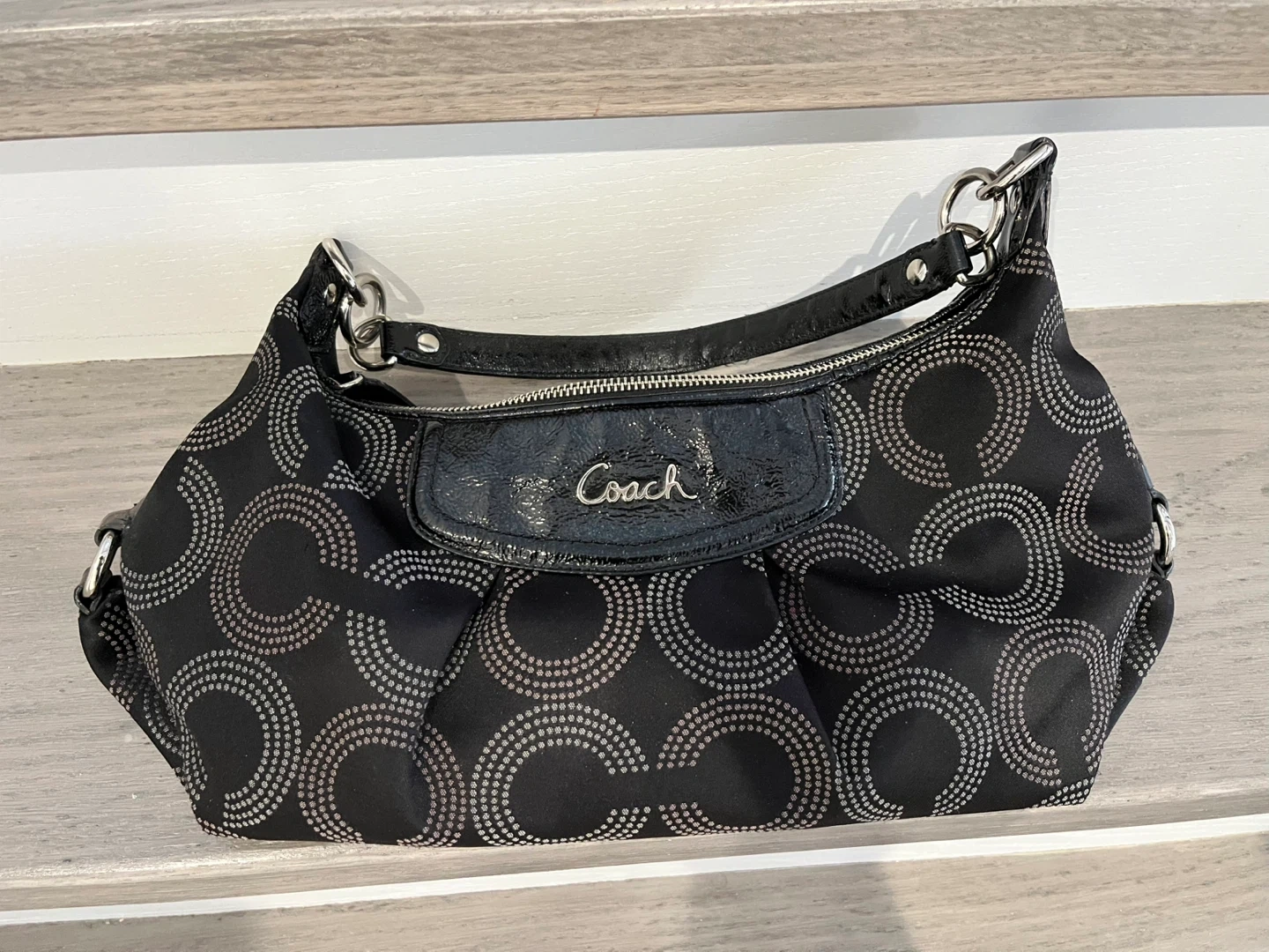 This is a Coach hobo shoulder bag in black with the signature C monogram pattern. It features patent leather accents and silver-tone hardware. The bag's interior is spacious enough for daily essentials. It is a vintage good condition bag. It was hand crafted from finest materials.