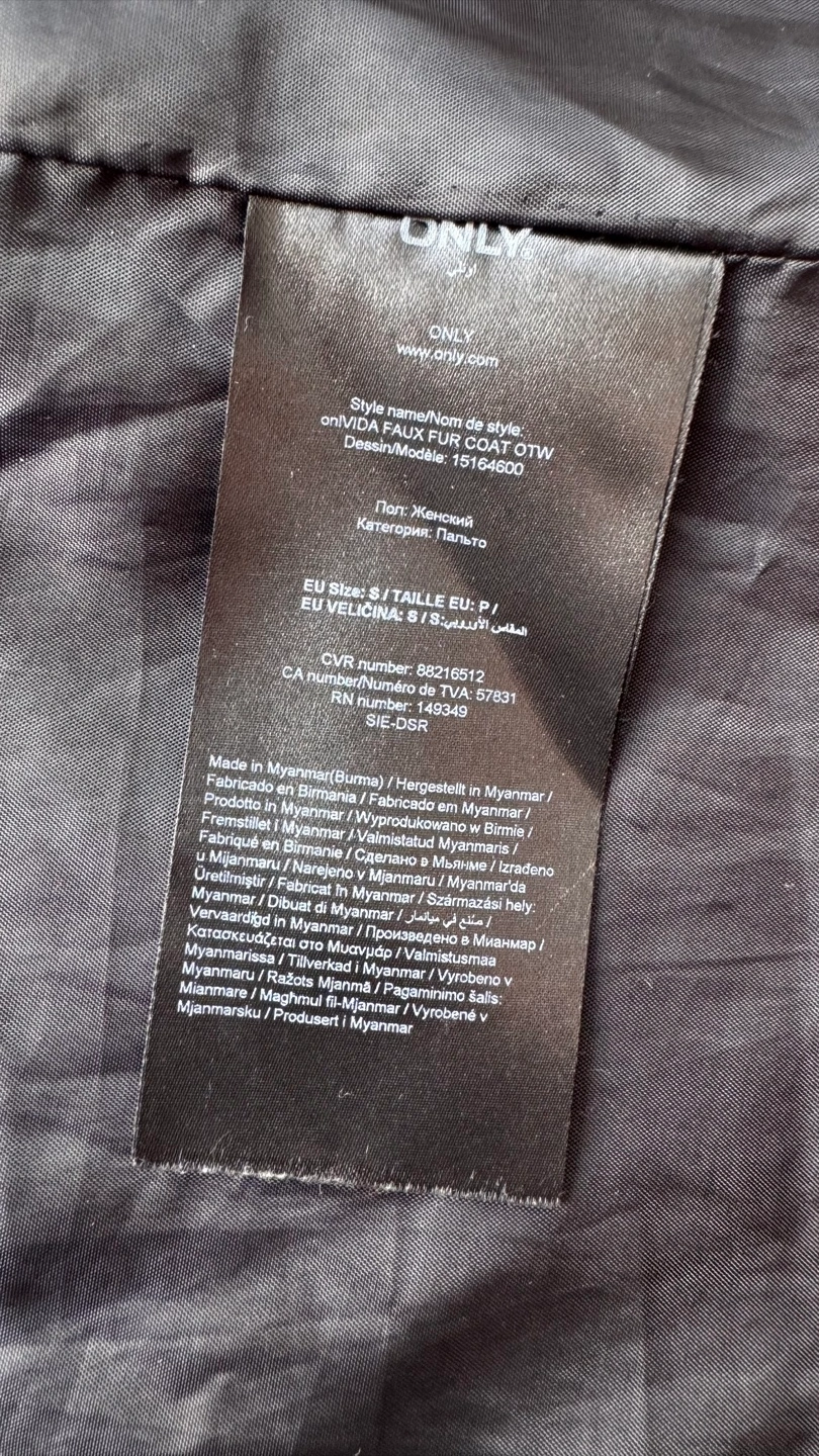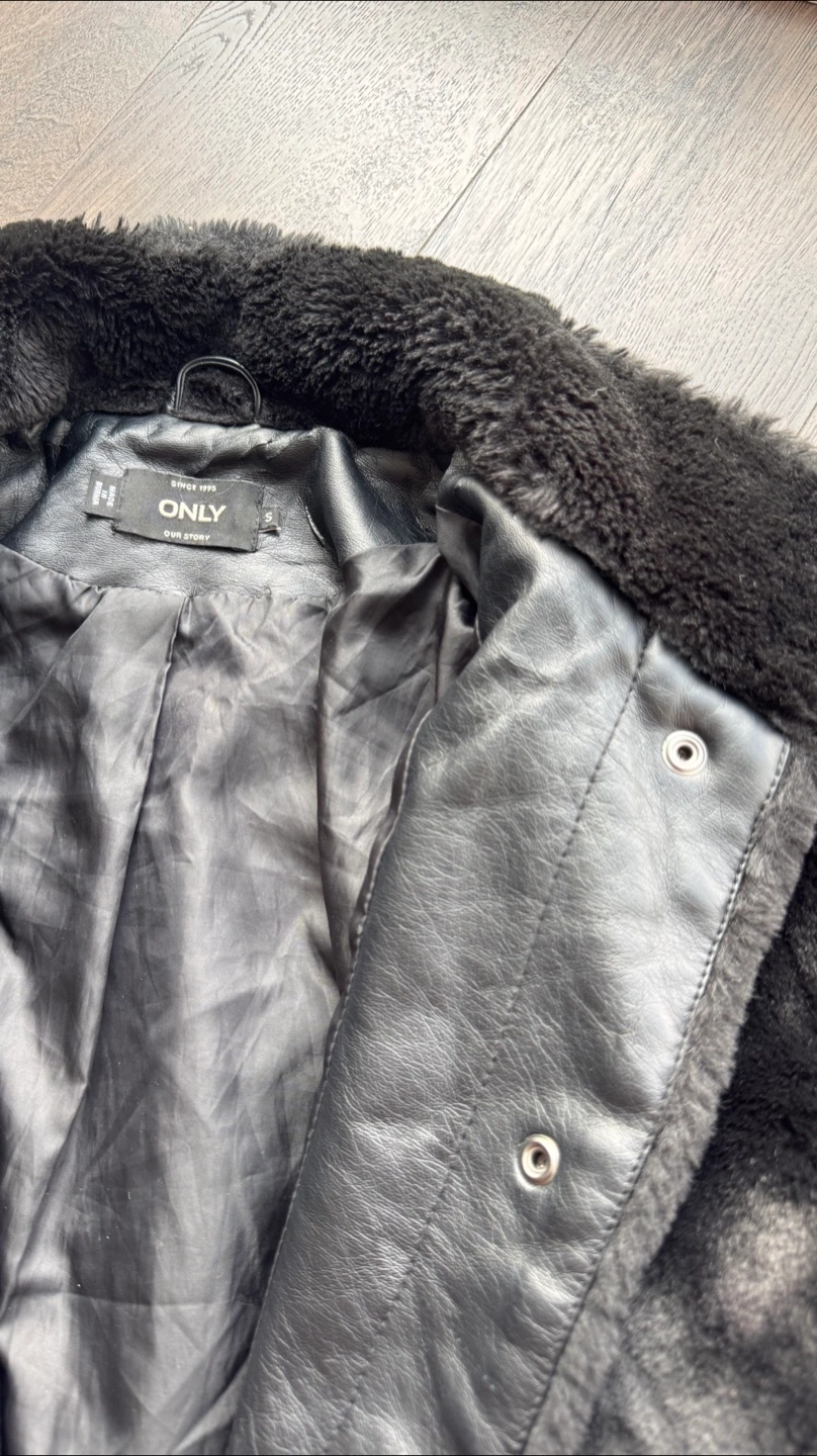 Cozy up in this stylish black faux fur coat from ONLY! It's a size S and features a chic design. Perfect for adding a touch of warmth and elegance to your outfit this season