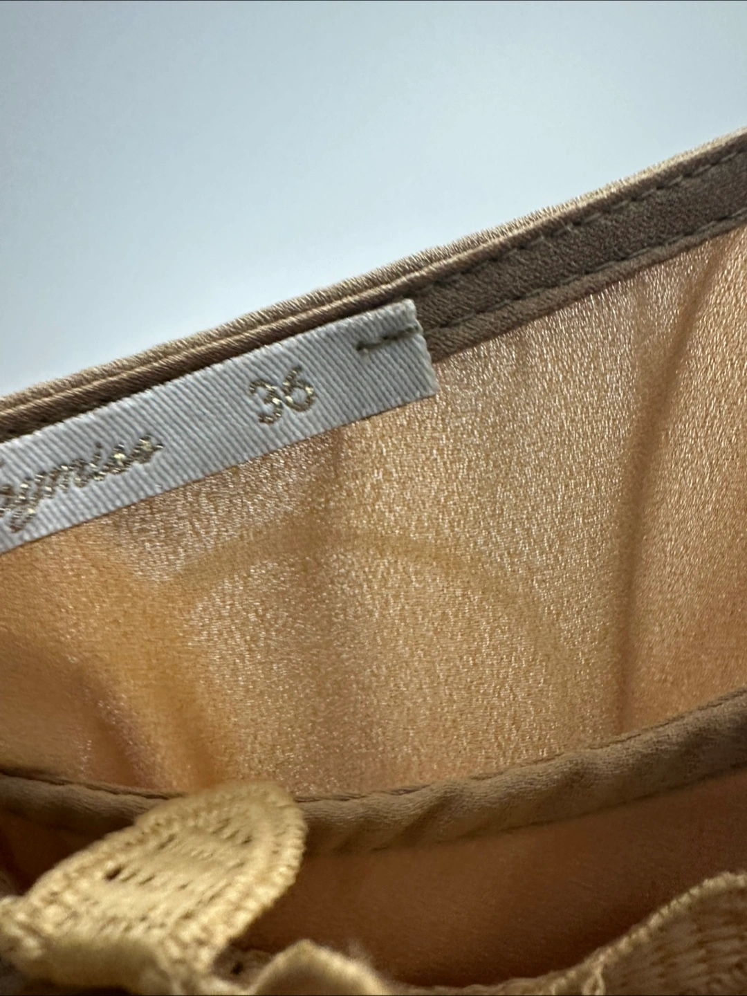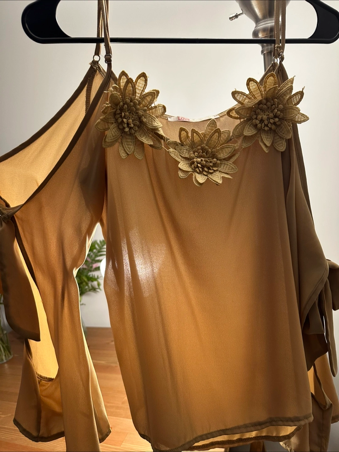 Lightweight, flowy blouse. Off-the-shoulder design. Three-quarter sleeves with tie detail. Floral embellishments at neckline. Size small.