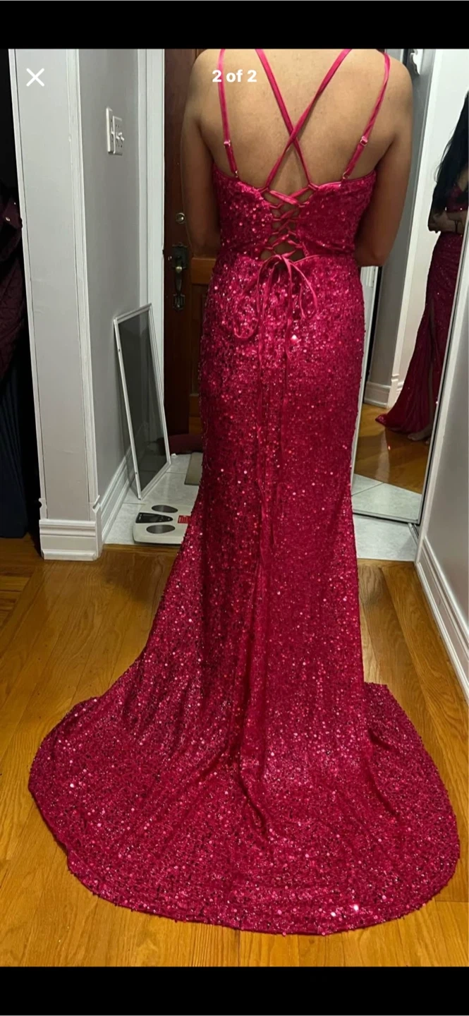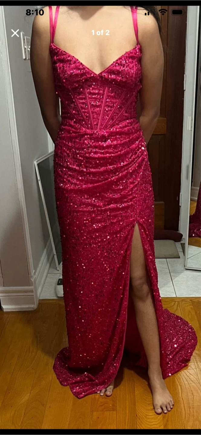 Gorgeous sparkly pink sequin dress with a corset bodice and lace-up back. It features a flattering ruched detail and a high slit for added elegance. This dress is sure to turn heads at any formal event!