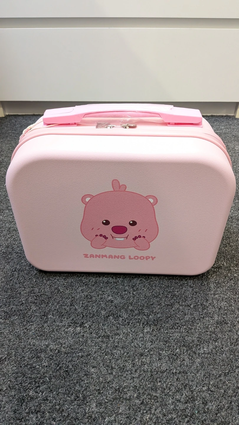 This MINISO train case features a cute pink Loopy design. It's perfect for storing makeup and toiletries. The interior has multiple compartments and zippered pockets.