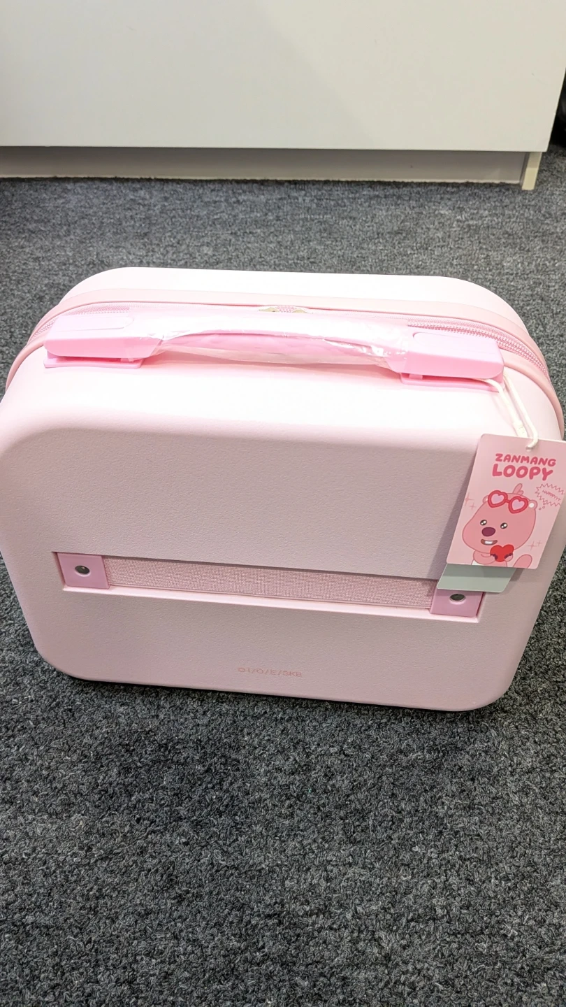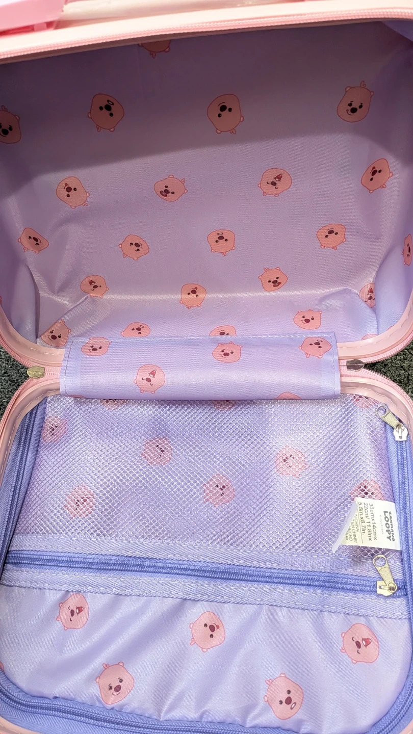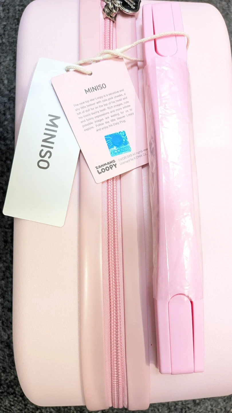This MINISO train case features a cute pink Loopy design. It's perfect for storing makeup and toiletries. The interior has multiple compartments and zippered pockets.