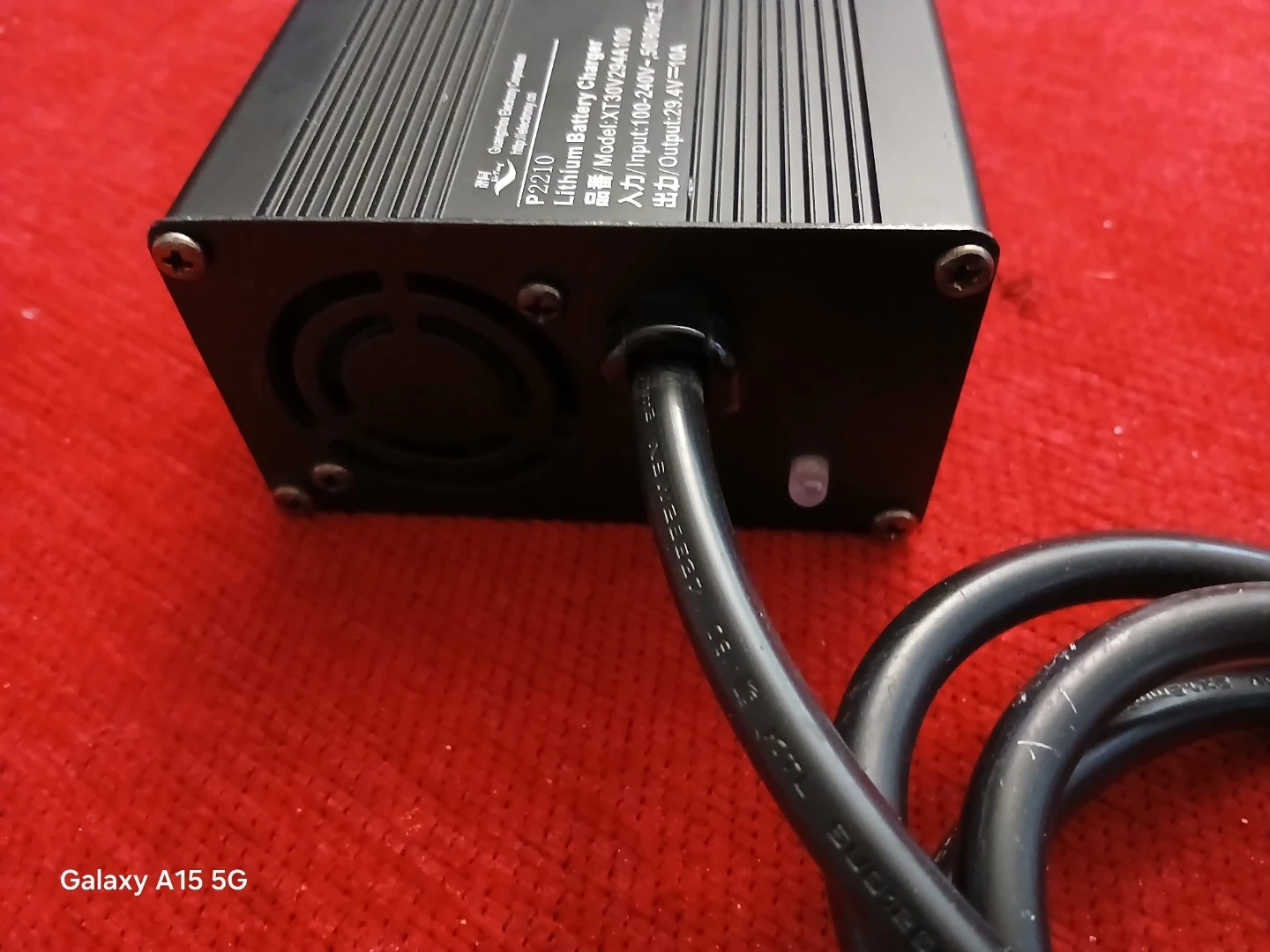 This is a Guangzhou Battery Corporation P2210 lithium battery charger. It supports 100-240V input and has a 29.4V, 10A output. The charger features LED indicators for charging status.