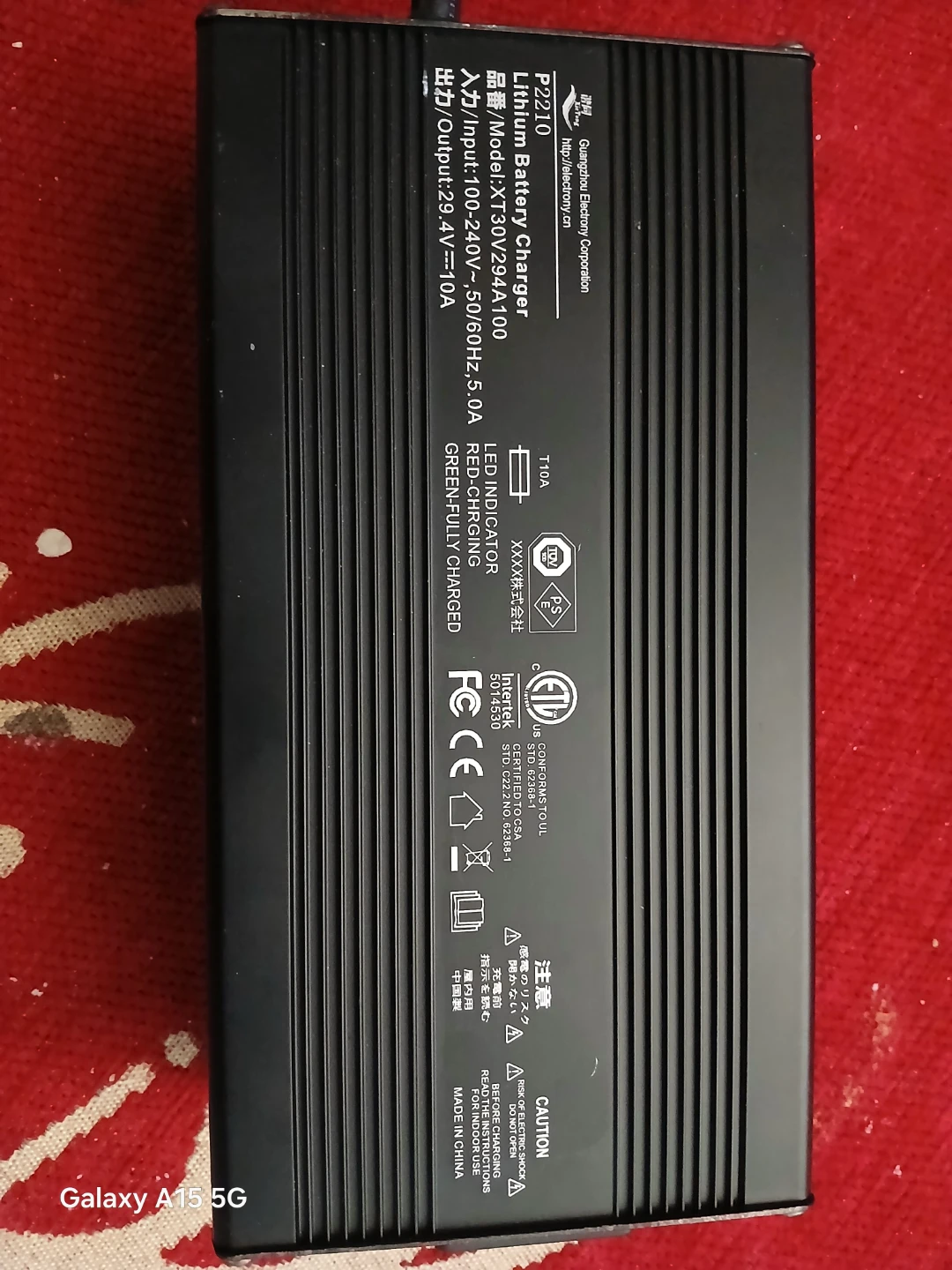 This is a Guangzhou Battery Corporation P2210 lithium battery charger. It supports 100-240V input and has a 29.4V, 10A output. The charger features LED indicators for charging status.