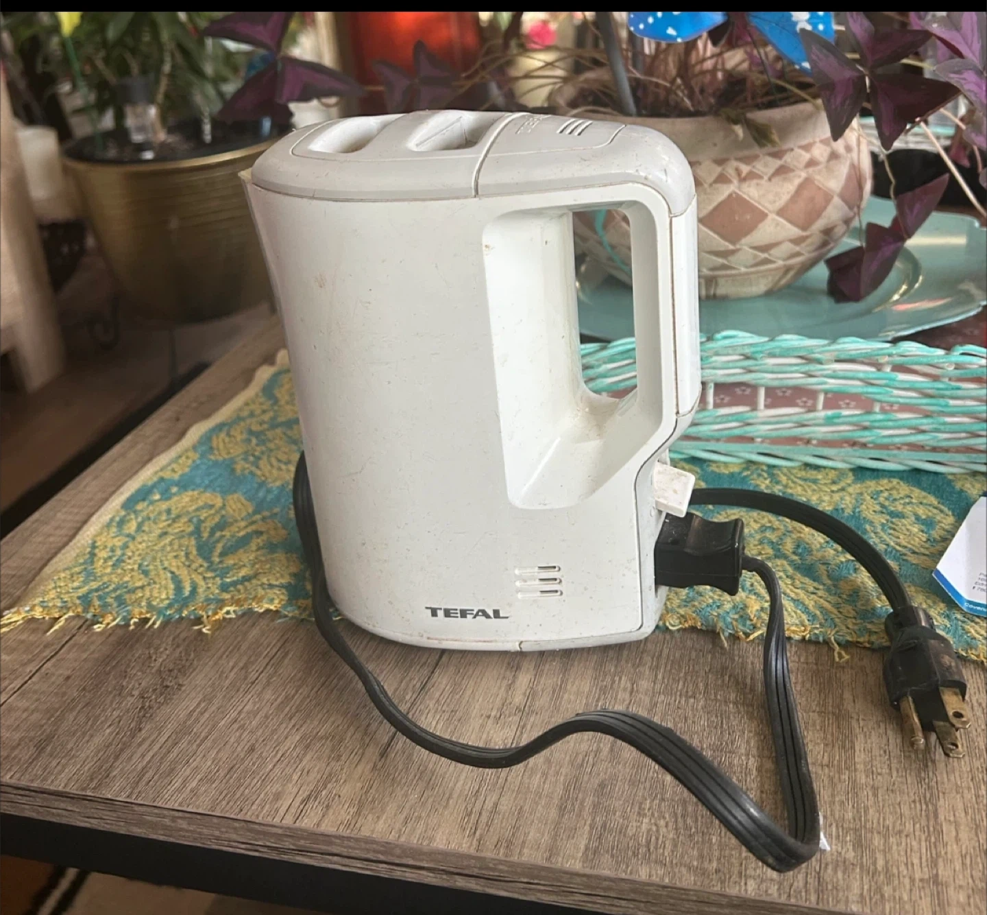 This is a white electric kettle by Tefal. It's a compact appliance perfect for quickly boiling water for tea or coffee. The kettle has a sturdy handle for easy pouring.