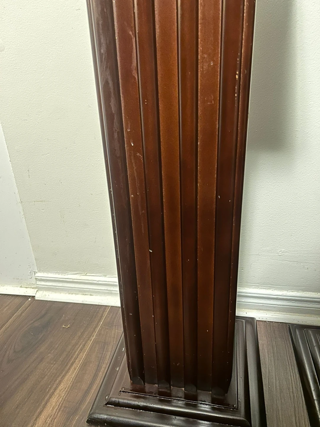 These pedestals are a dark brown colour. They have a fluted column design with a square top and base. A few minor scuffs on the top surfaces. Stand approximately 30 inches tall.